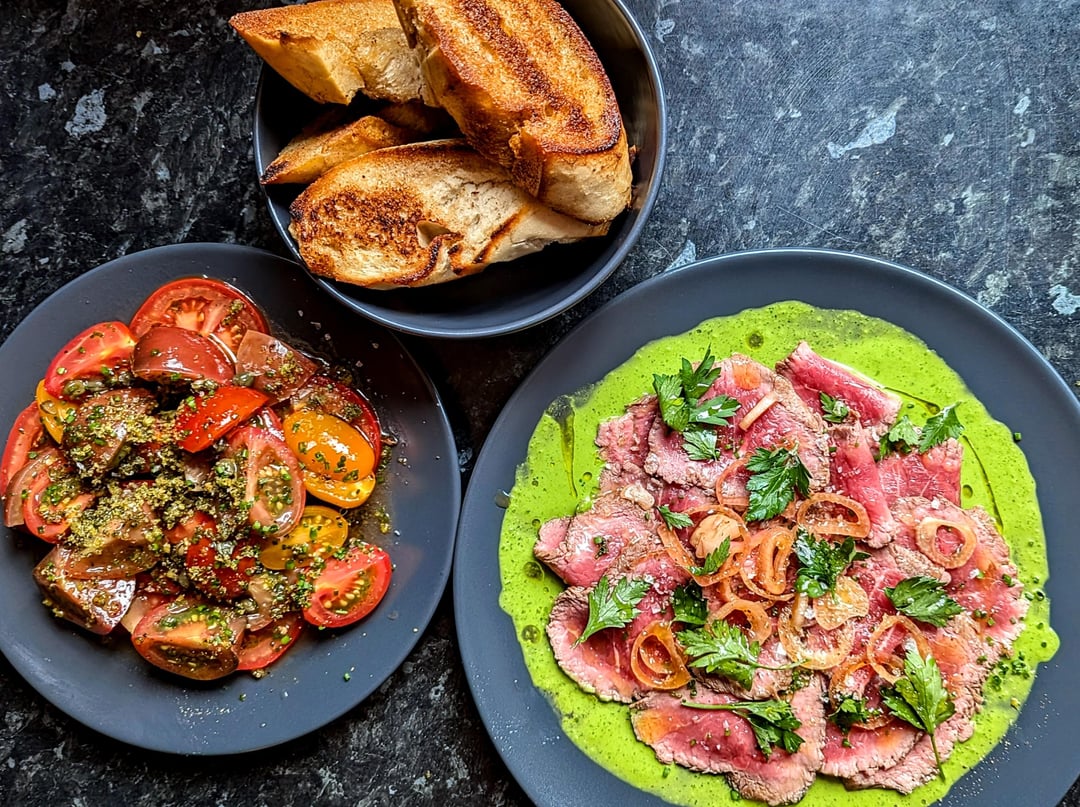 Beautiful British lamb fillet, parsley & anchovy sauce with Hendo’s pickled onions. Plus some beautiful British tomato salad and lamb fat toast.