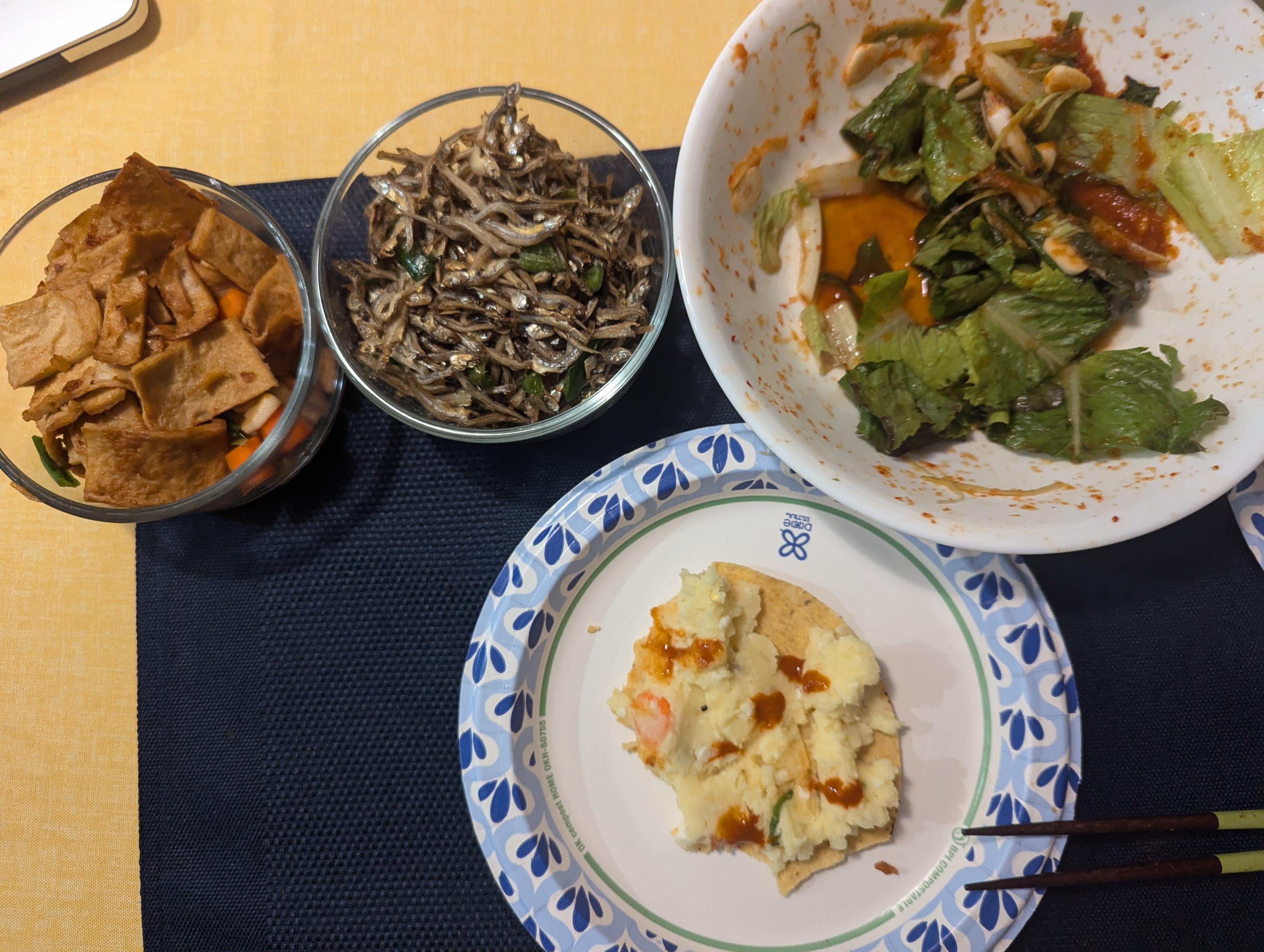 어목볶음,멸치볶음, Salad they give you at Korean BBQ and 감자 샐러드 in a tostada. Husband wanted some potato salad on a tostada.