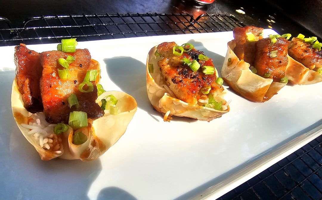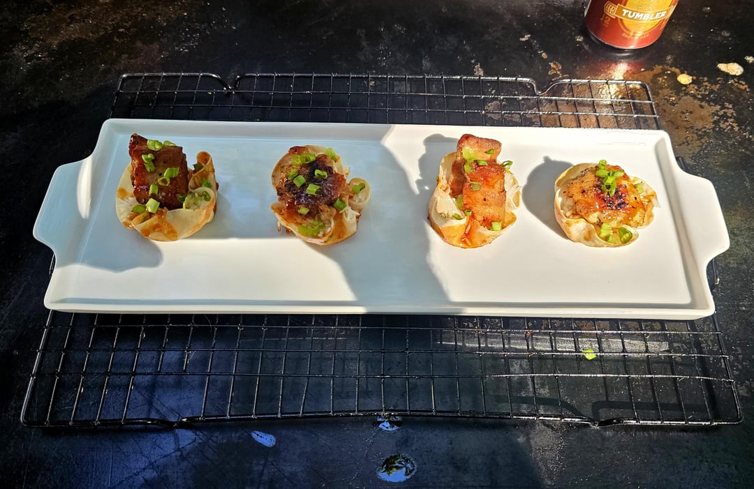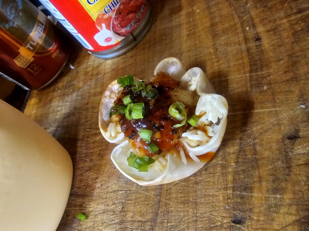 The "cups" or whatever you want to call them are dumpling wrappers baked in a muffin tin at tree fiddy until they got crispy.
