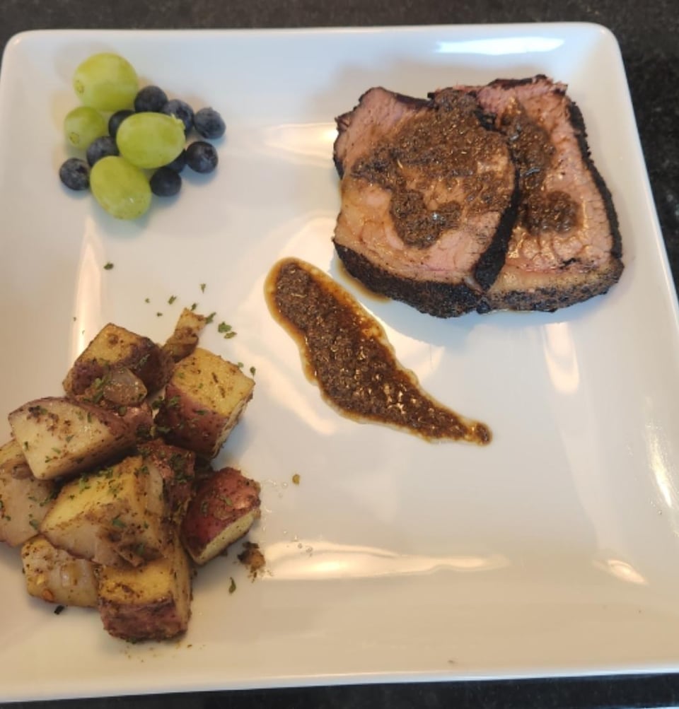 Seasoned with black garlic, garlic salt, onion powder, oregano, and pepper before going into the bag. Ice bathed for 30 mins or so before going over vortex charcoal and a blowtorch. Made an au jus from the juice mixed with some caramelized onions, and some hobo potatoes. Easily the best bottom round i've made (even though it looks a little more done than you'd think).