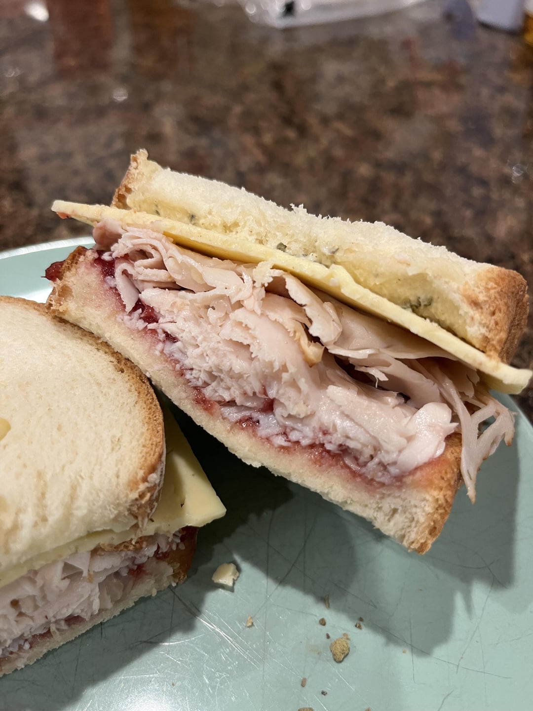 Cranberry sauce, mesquite smoked turkey, havarti, poultry seasoning, and mayonnaise on farmhouse white.