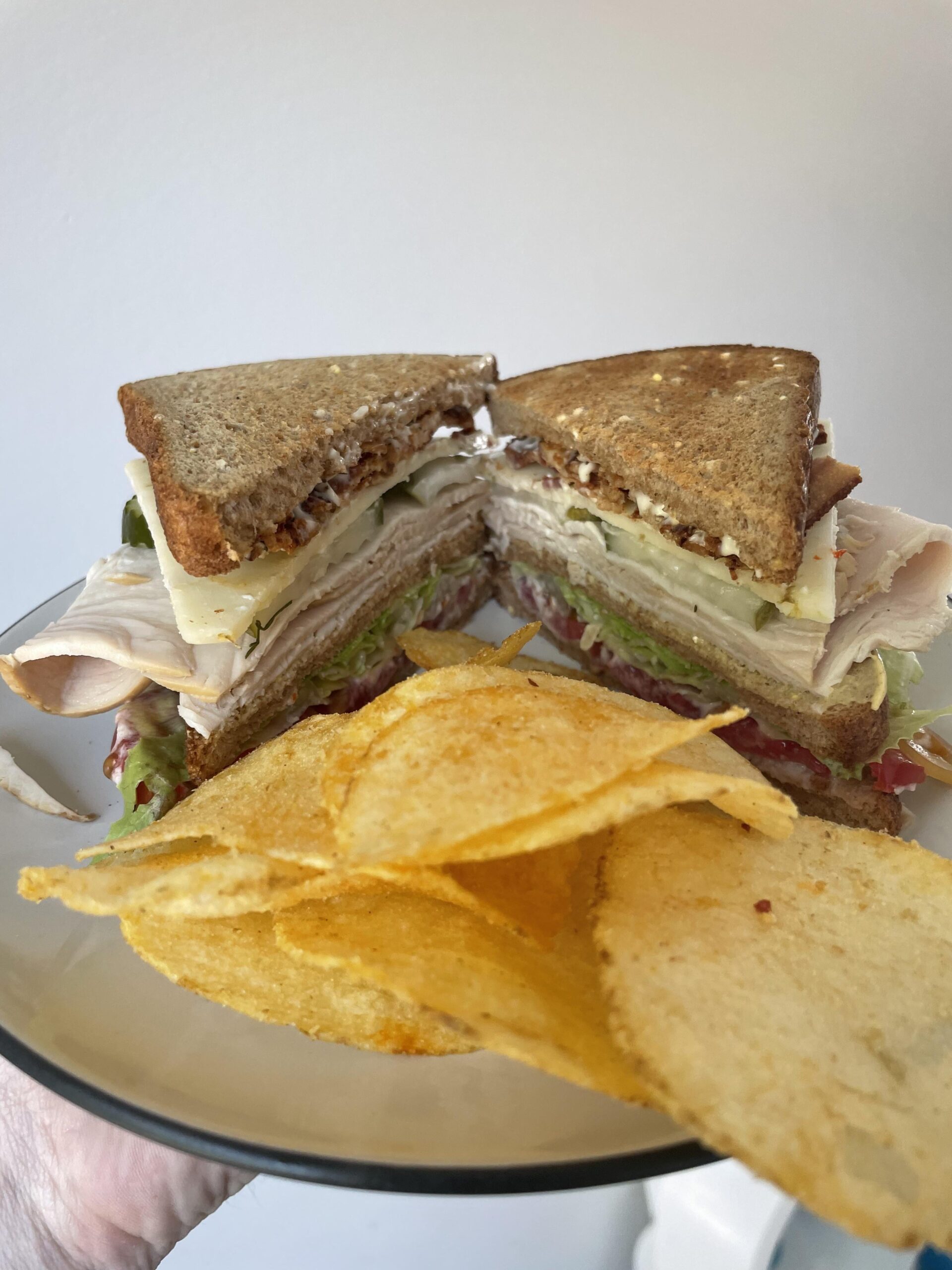 From top to bottom: whole grain toast, Duke’s mayo, black pepper, bacon, pepperjack, Grillo’s pickles, smoked turkey, dijon mustard, whole grain toast, romaine, pickled chili peppers, flaky salt, tomatoes, whitefish salad, and finally, another piece of whole grain toast. Hot honey flavored chips on the side.
