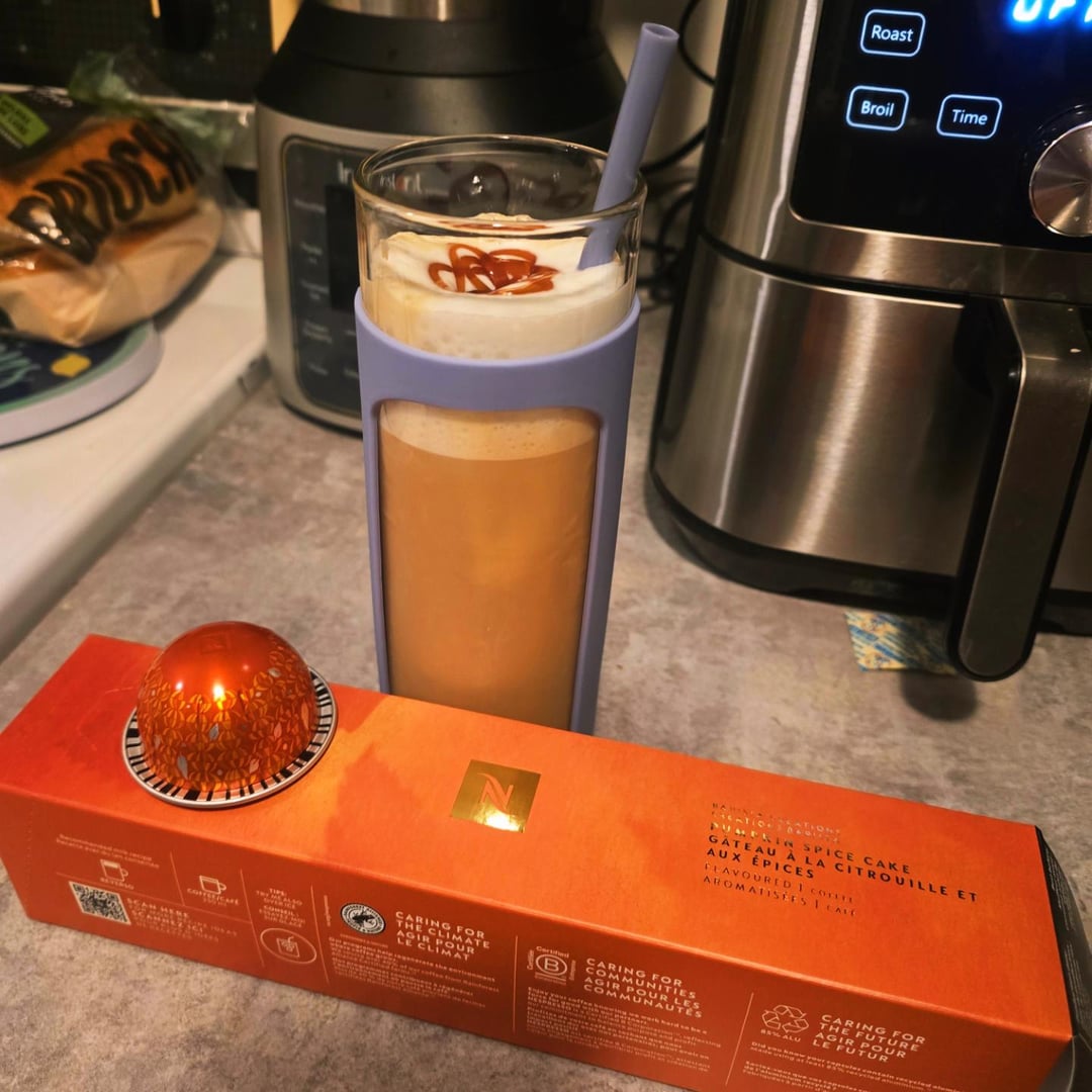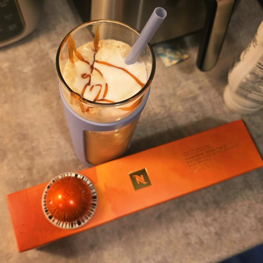 The new Pumpkin Spice Cake exclusive pod from Nespresso πβ Brewed as a reverso into milk , then chilled in hyper chiller. Sugar free vanilla cold foam and a squirt of sugar free caramel on top ! π€€