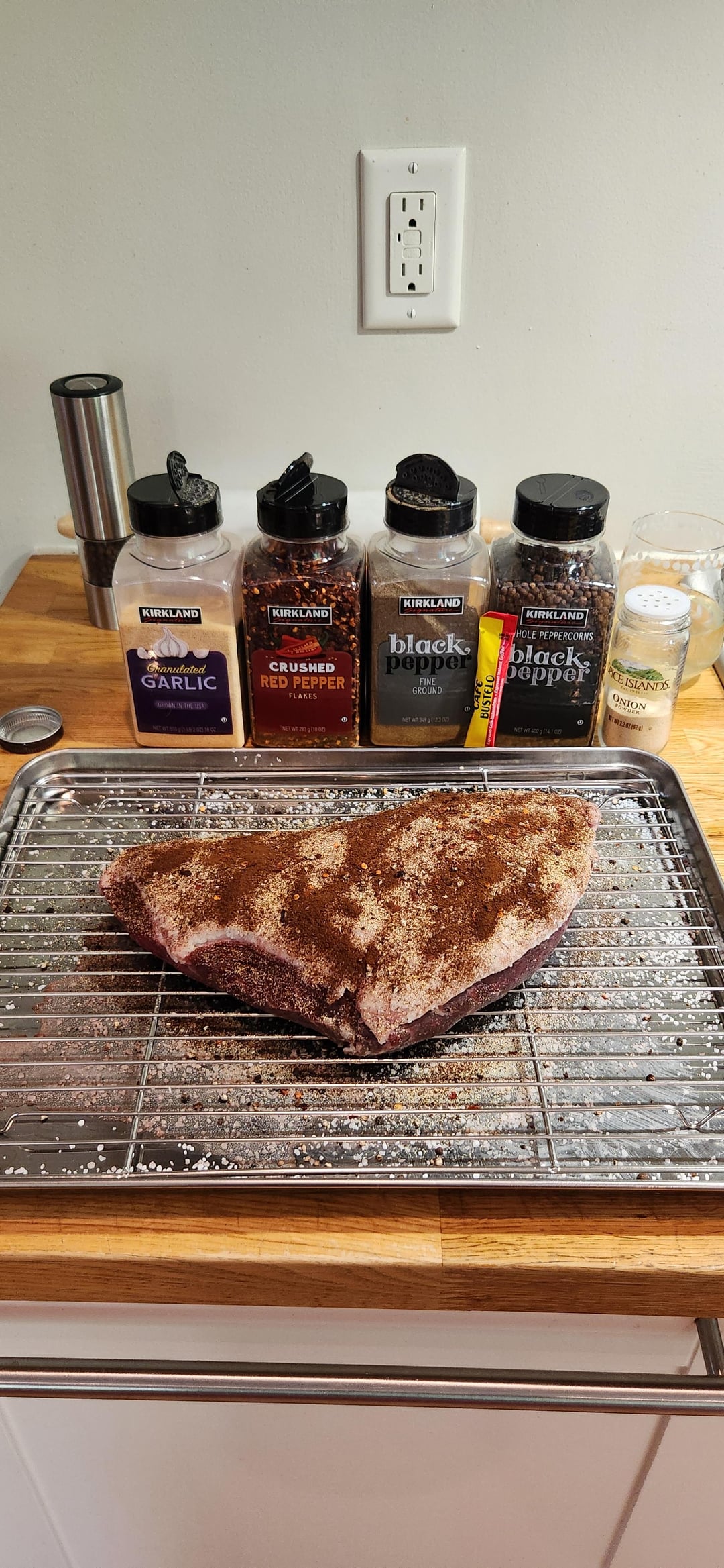 3. Seasoned liberally with pepper, garlic powder, onion powder, chili flakes, and instant espresso.