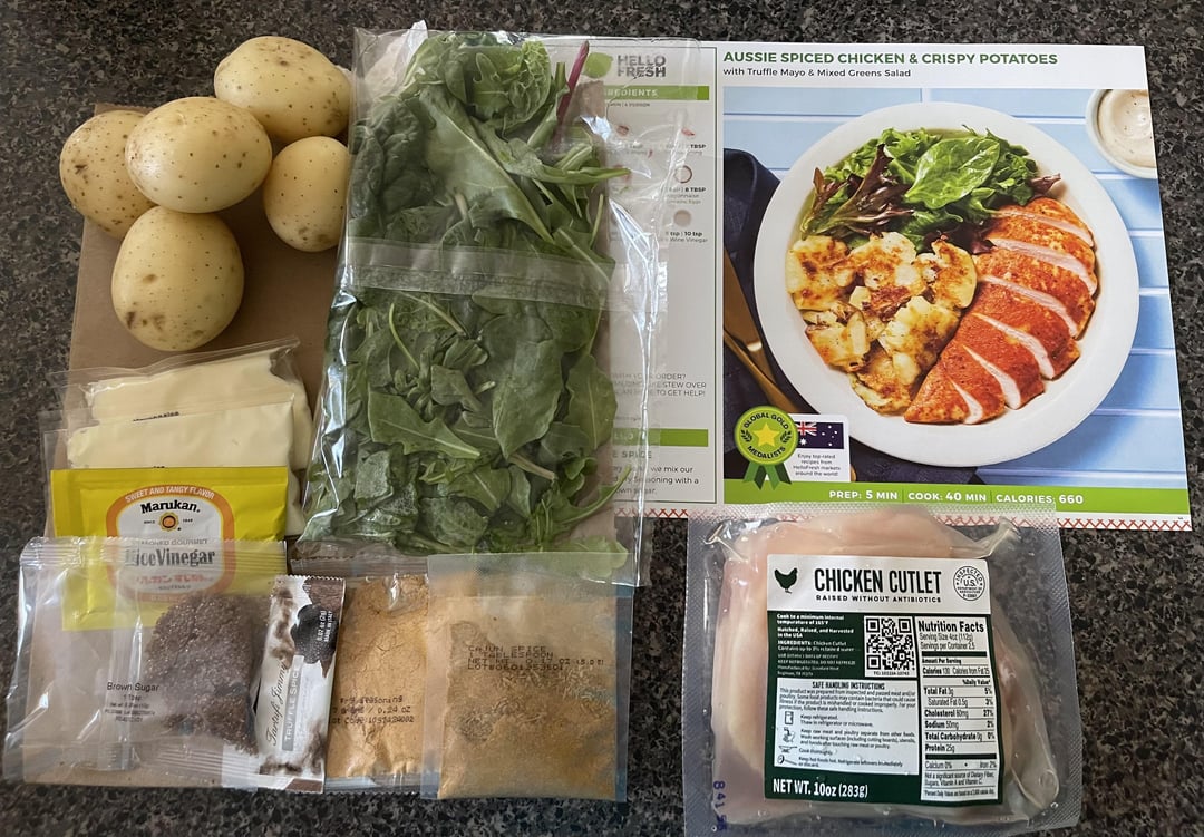 This meal was sent a few weeks ago and went straight to the freezer so I no longer had the salad and potatoes. The only potatoes I had on hand were the variety: red, gold and purple potatoes. So those aren’t burnt potatoes, they’re just purple! lol.