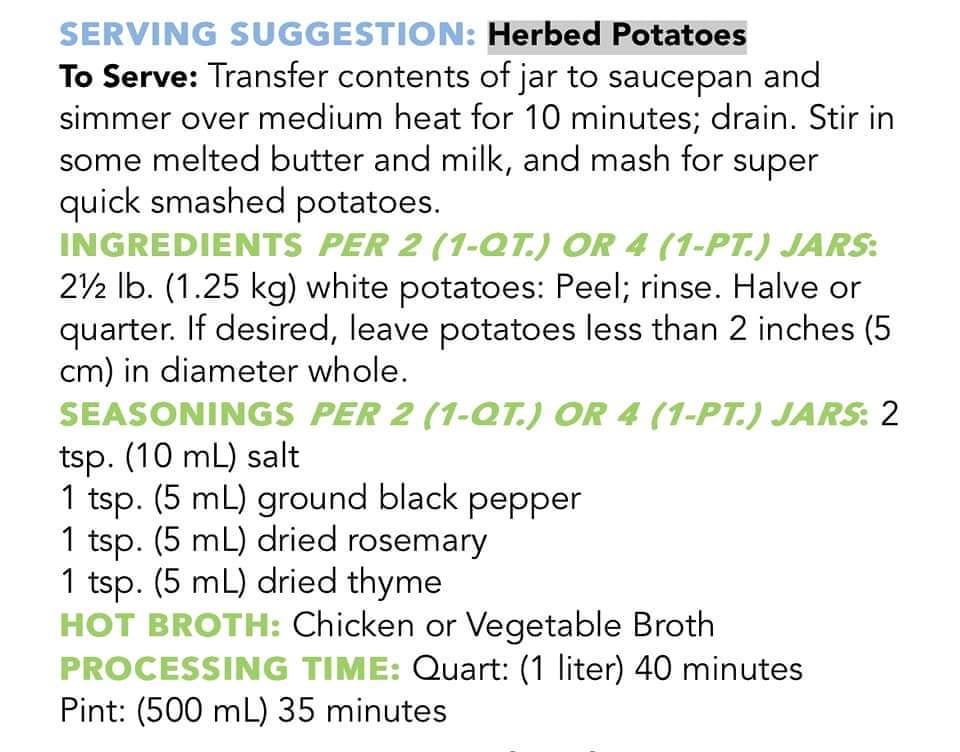 Recipe in second photo, from the newest Ball book. Herbed Potatoes, canned without the herbs.