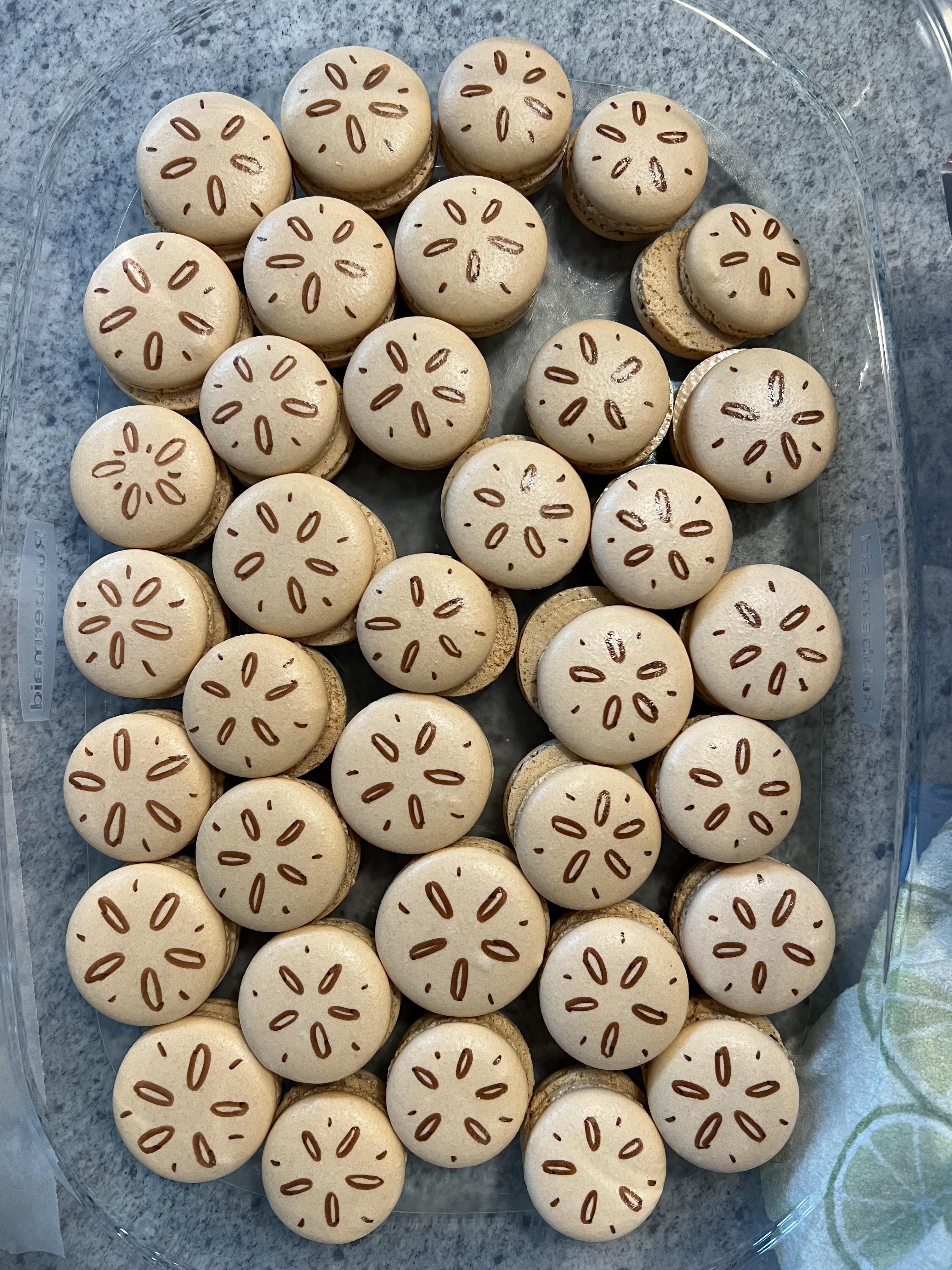 Picture for attention…some sand dollar macarons I’m making for my daughter’s first birthday (I’m wanting to do Vietnamese coffee flavor, send me your recipes if you have a good one!).