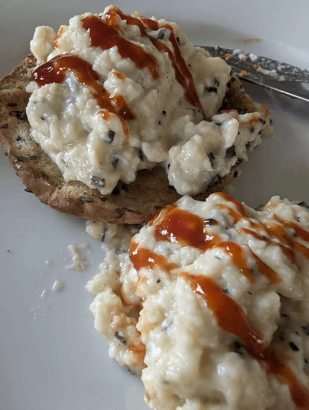 Soft scramble, salt, pepper, chives, butter, and sriracha. Eggs are a bit pale, maybe put a little too much milk in. On a protein thin bagel w/salted butter.