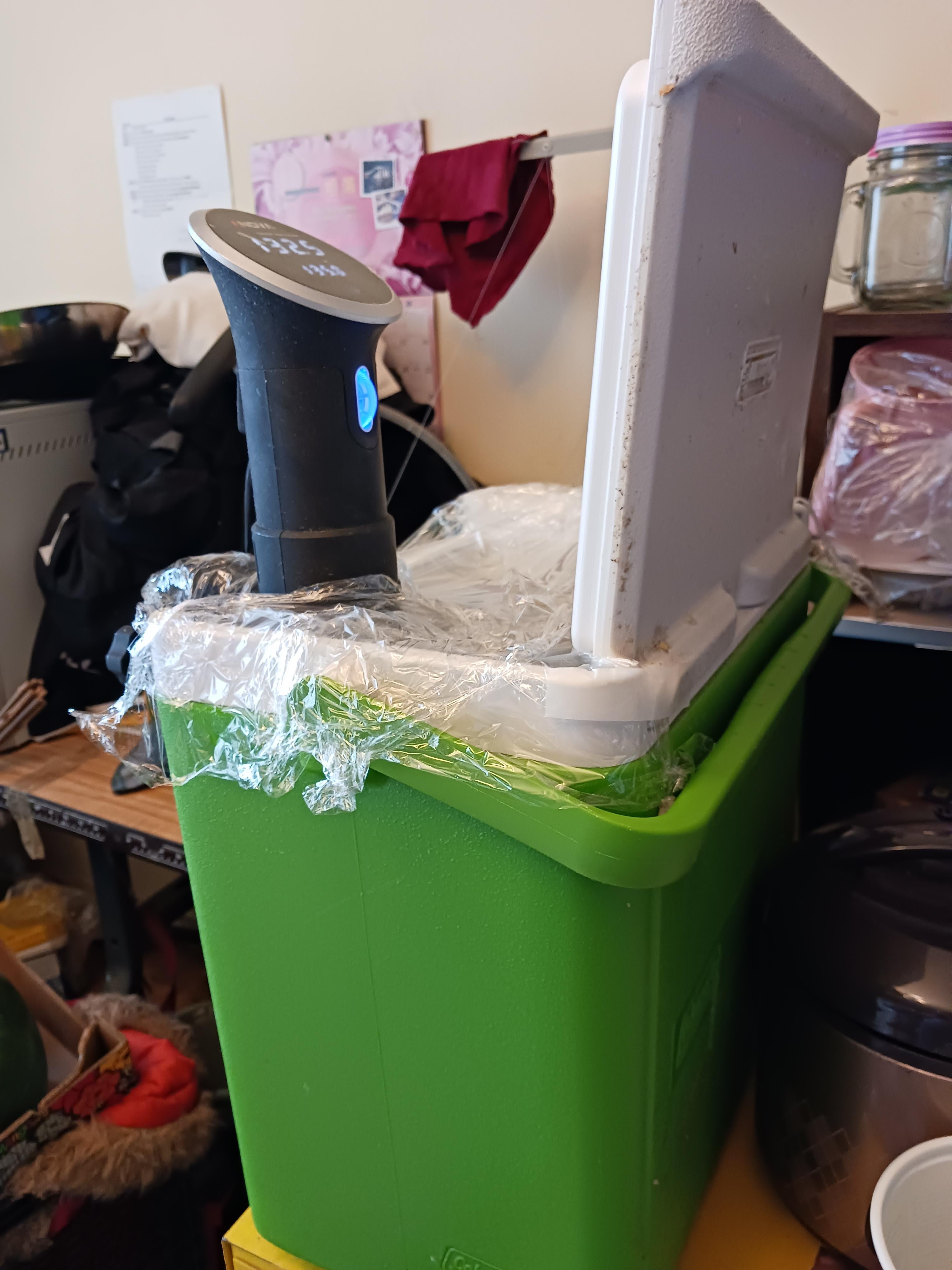 Would highly recommend investing a tiny bit of money in ping pong balls. They do so much better than the shrink wrap, don’t drip everywhere, they help get to and keep temperature just right, helps with evaporation, and are easier to manage if you need to get in there during a cook. I do a double layer on top and it makes cooler cooking much easier.