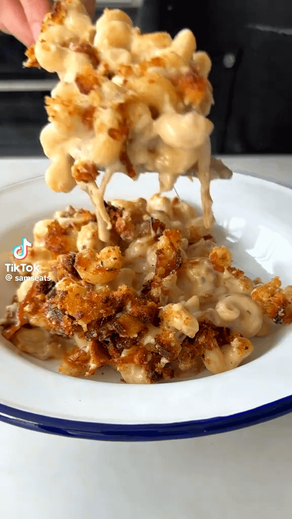 – Fold béchamel into the cooked pasta, top with the caramelized onions, bread crumbs and more Gruyère, broil until golden and crispy