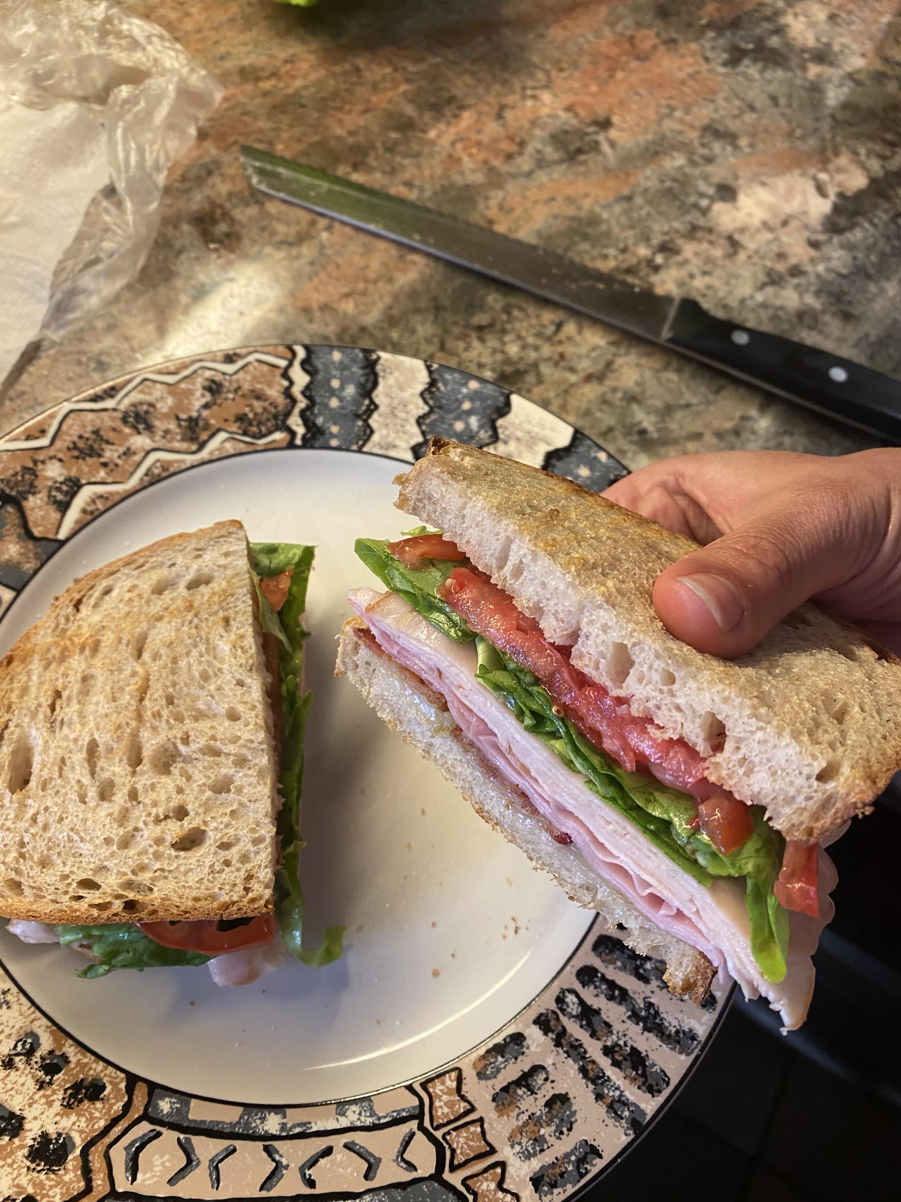 Homemade sourdough, pepperjack, bacon, ham, honey Turkey, Boston lettuce, heirloom tomato, olive oil S&P