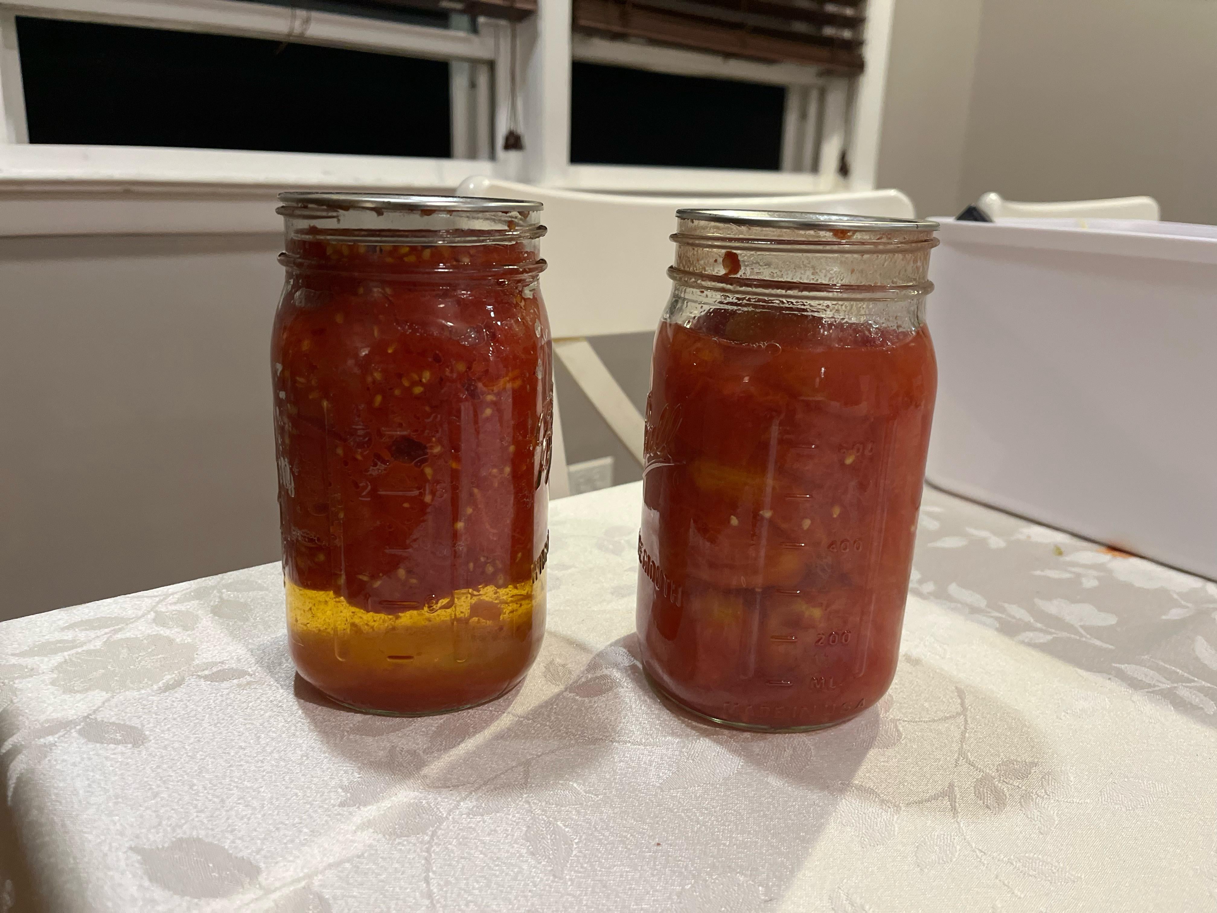 Are the ones on the right ok? Canned in same batch. Everything seems tightly sealed and button isn’t popped. I can’t remember if they were floating before. Quarts of whole peeled raw-pack Romas pressure canned on 8-17-24. Thanks!
