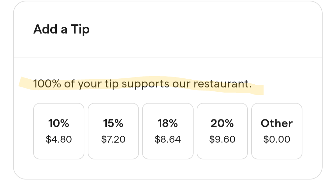 Since this doesn't say, 100% of your tip goes to our staff, I don't know what this means. Does the restaurant keep it? Is it pooled exclusively among the staff? by singletonaustin Write A CommentYou must be logged in to post a comment.