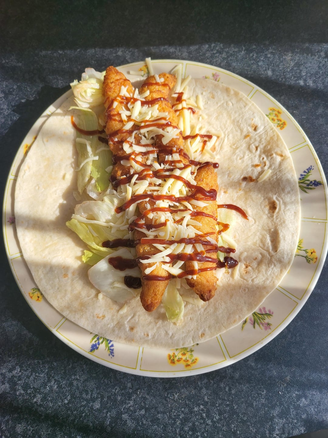 Crispy chicken strips with, iceberg lettuce, coleslaw, mozzarella cheese and BBQ sauce in a flour tortilla wrap.