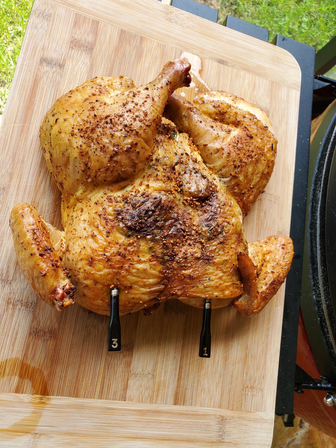 The skin didn't come out crispy as seen in his original video (https://youtu.be/4wN5Ksh1u3Q?si=_VAAKBMH-OW4STn0) and honestly flavor wasn't all there… not sure if it was the rub I used but I'm used to marinating foods or dry brining. Pictures provided are the setup of my girl and chicken resting.