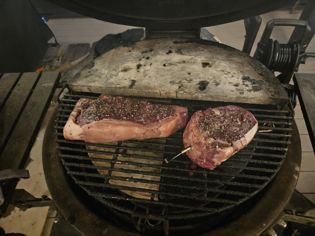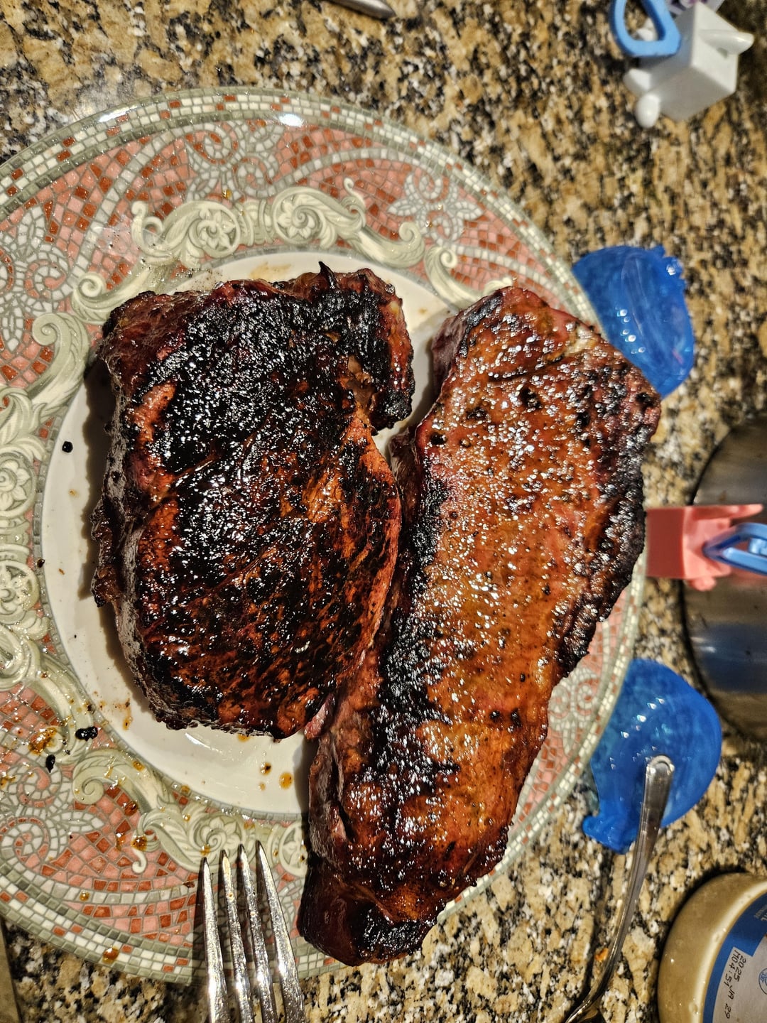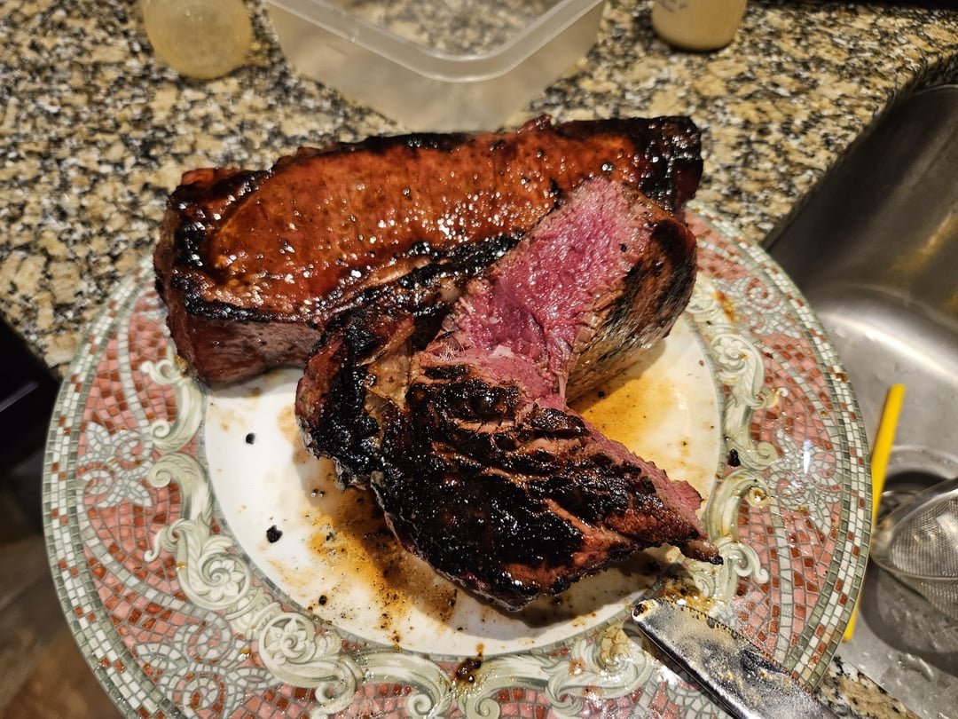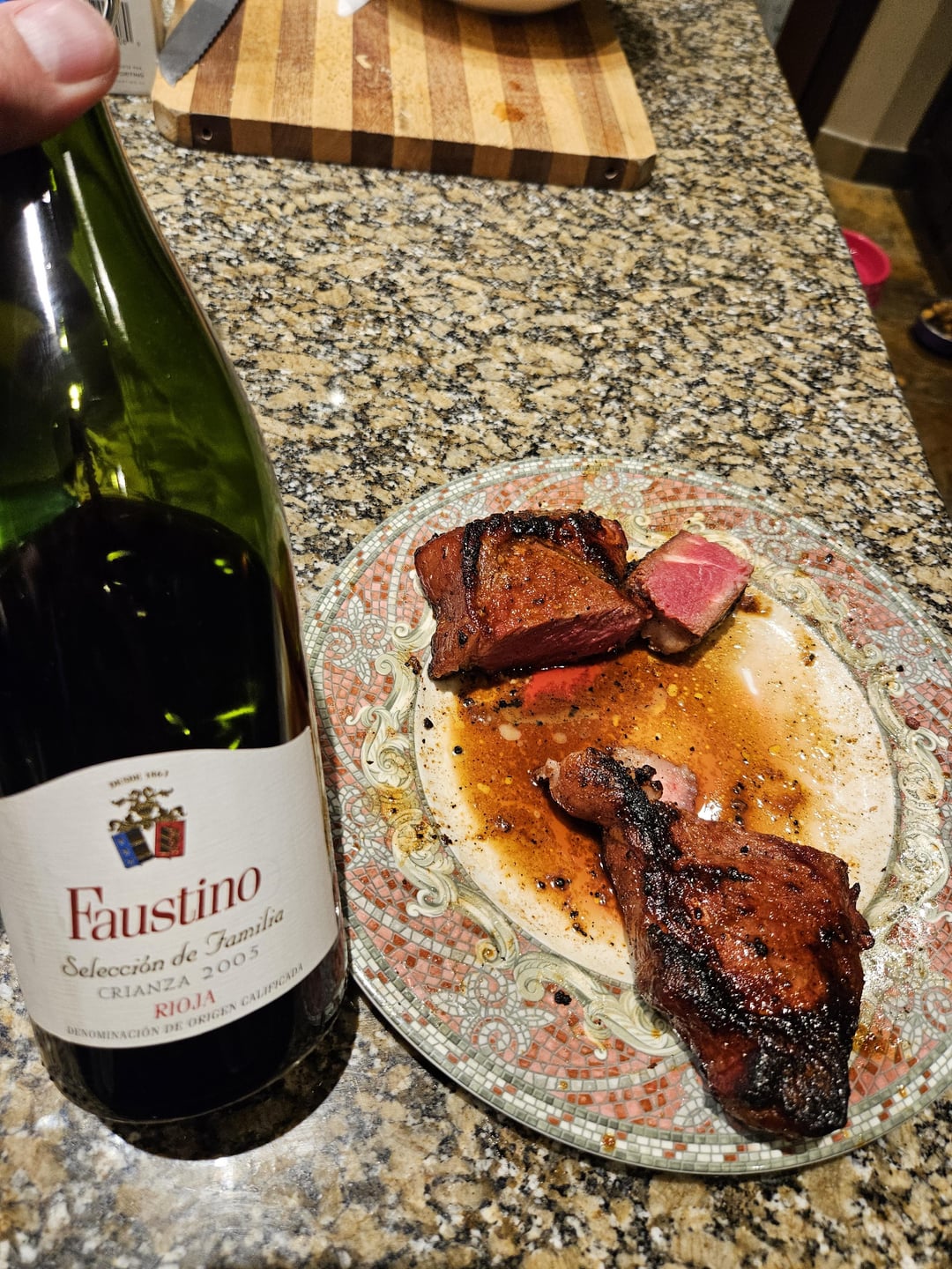Went with a sear sauce this time and a light Japanese style sauce post sear. Went with something old from the cellar as accompaniment. Got perfect rare on the fillet and medium rare on the strip as planned
