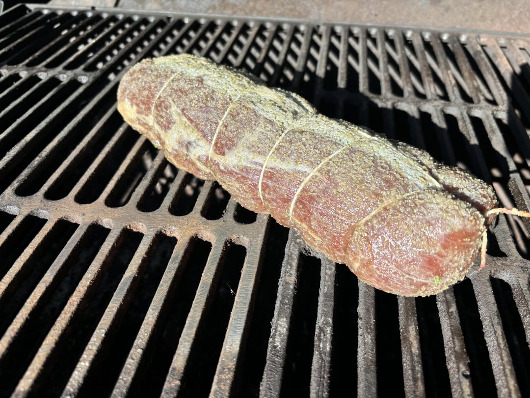 Trussed and salted, fridge for 6 hours, on the smoker for 1 hour 100C, then sous vide 54.4C 2 hours, finally quick sear in the pan.