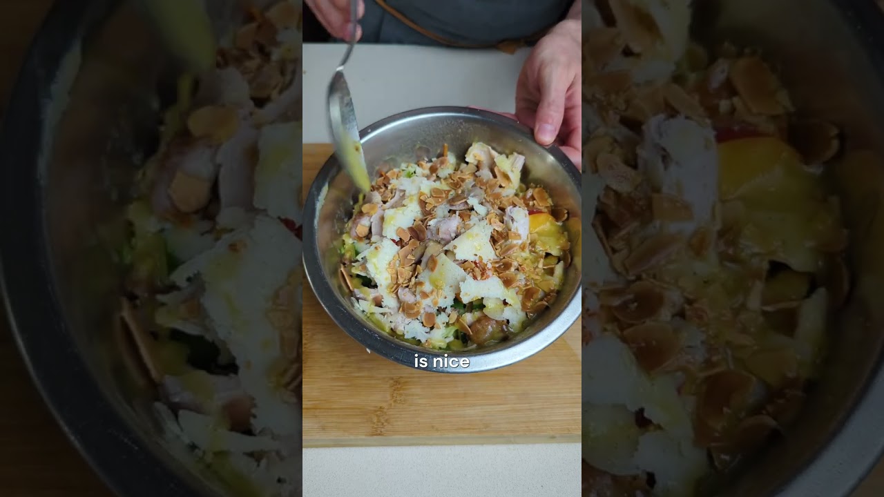 ➍ Assemble the salad by adding salad leaves to a large bowl, then add farro, roast vegetables, sliced fruit and veg, shaved parmesan, roast chicken, and plenty of your dressing.