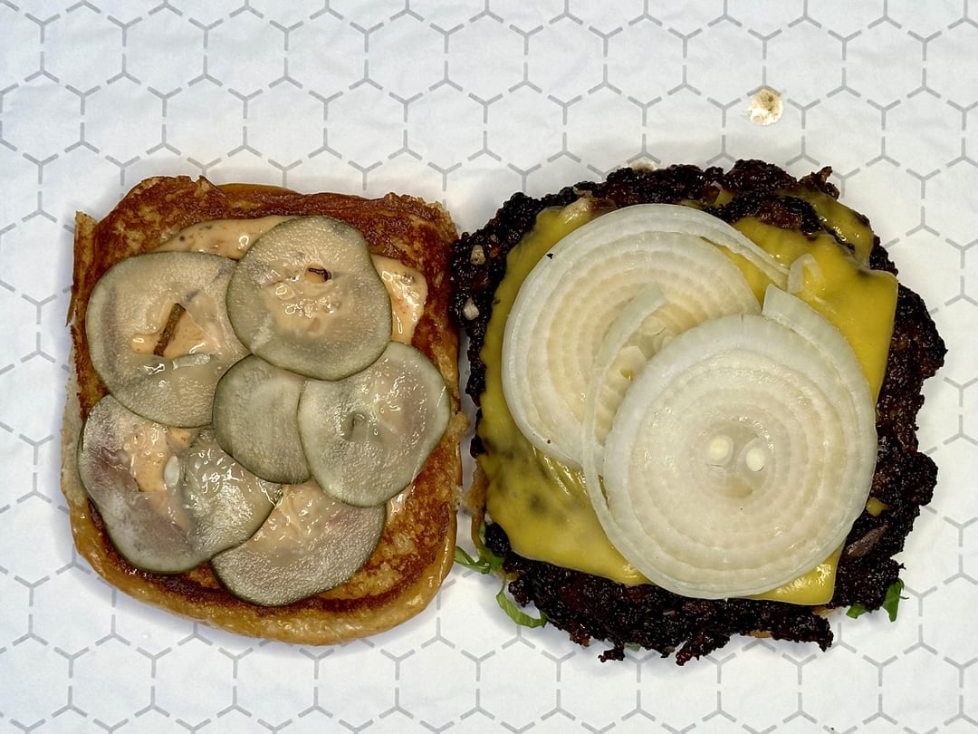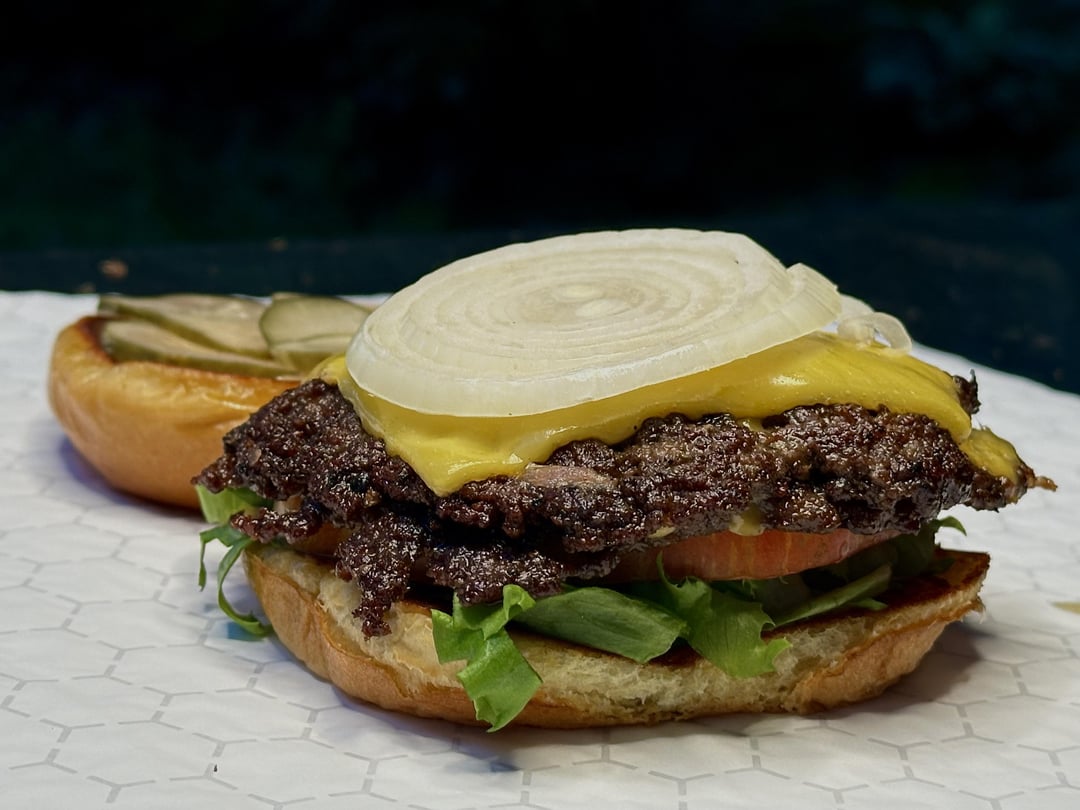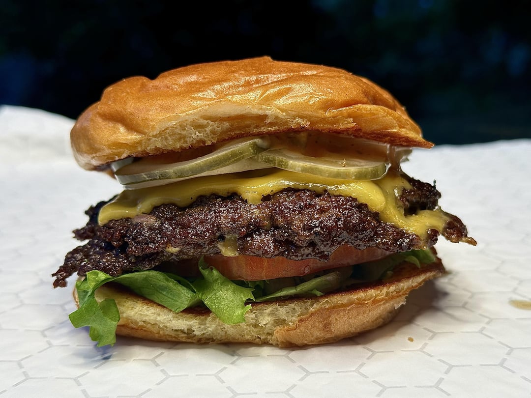 An old fashioned double smash burger with the works! Home-ground chuck, American cheese, lettuce, heirloom tomato, pickles, onions, and homemade burger sauce, on a buttered and griddled brioche bun.