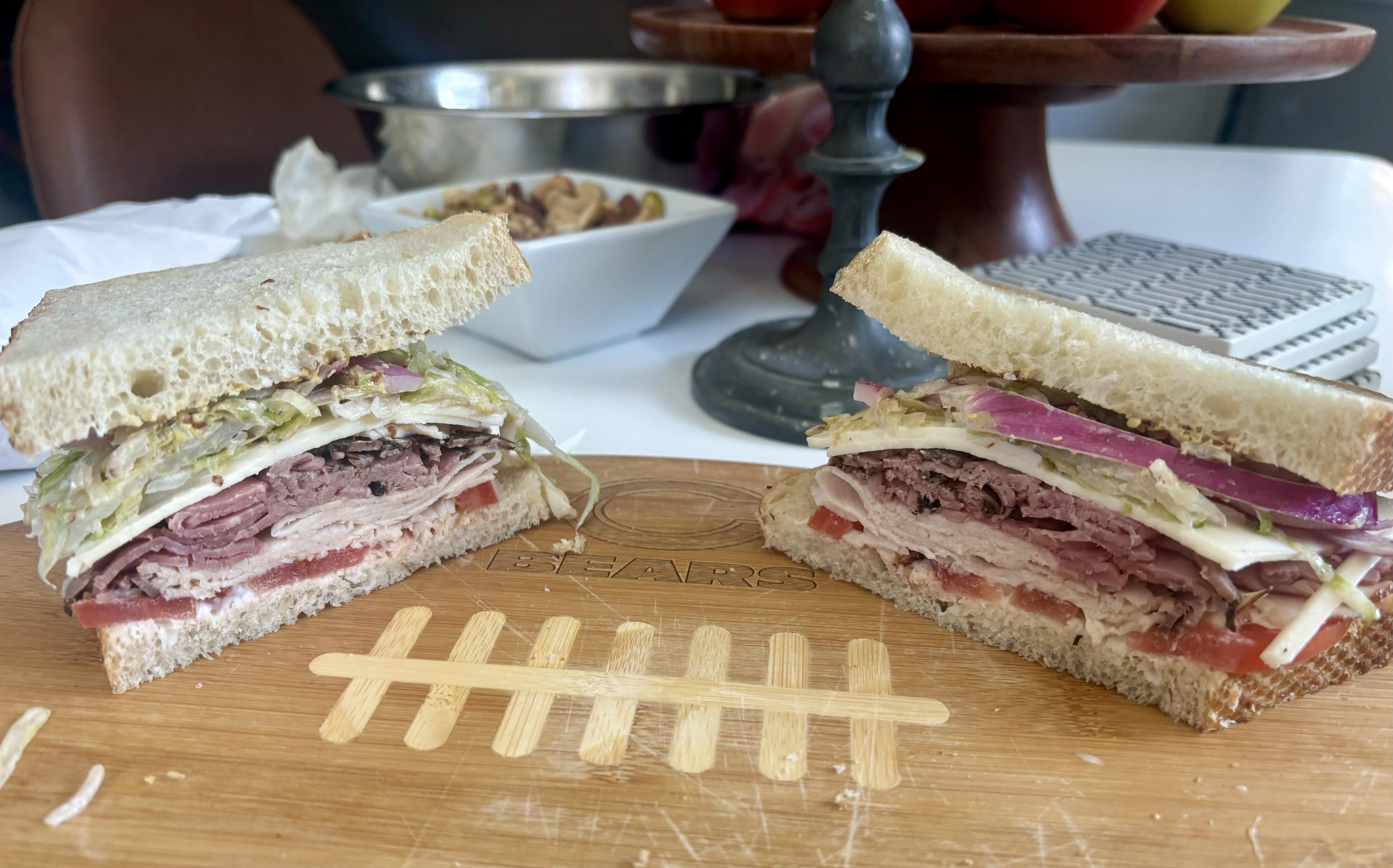 Sourdough, mayo, tomatoes, smoked turkey, roast beef, white american, dressed shredduce and onion, dijon