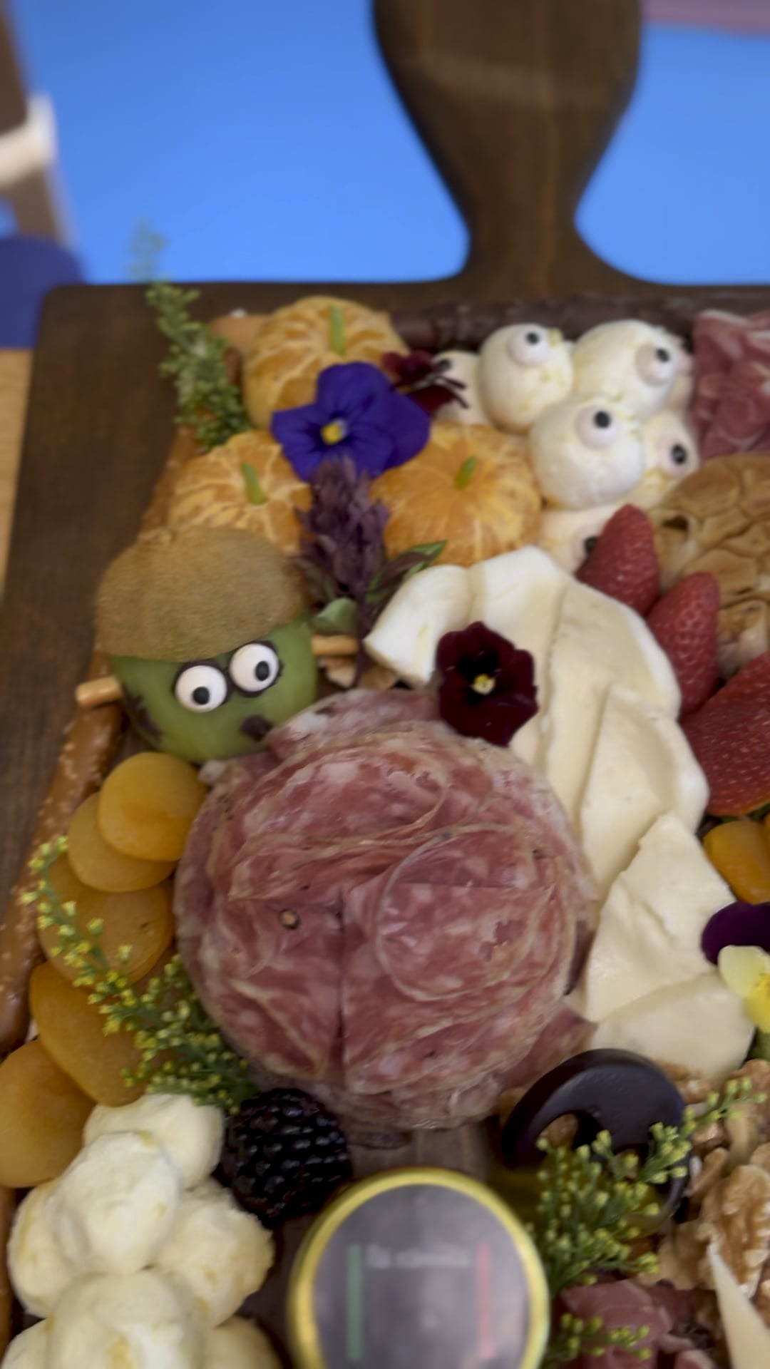 Here’s one variation I do on a long board using pretzel rods to try to get it in the shape of a coffin. I made some Franken-kiwi, mandarin pumpkins, goat cheese eye balls, apple mummies and some rambutan creepers. (The key is clearly the googly eyes.)