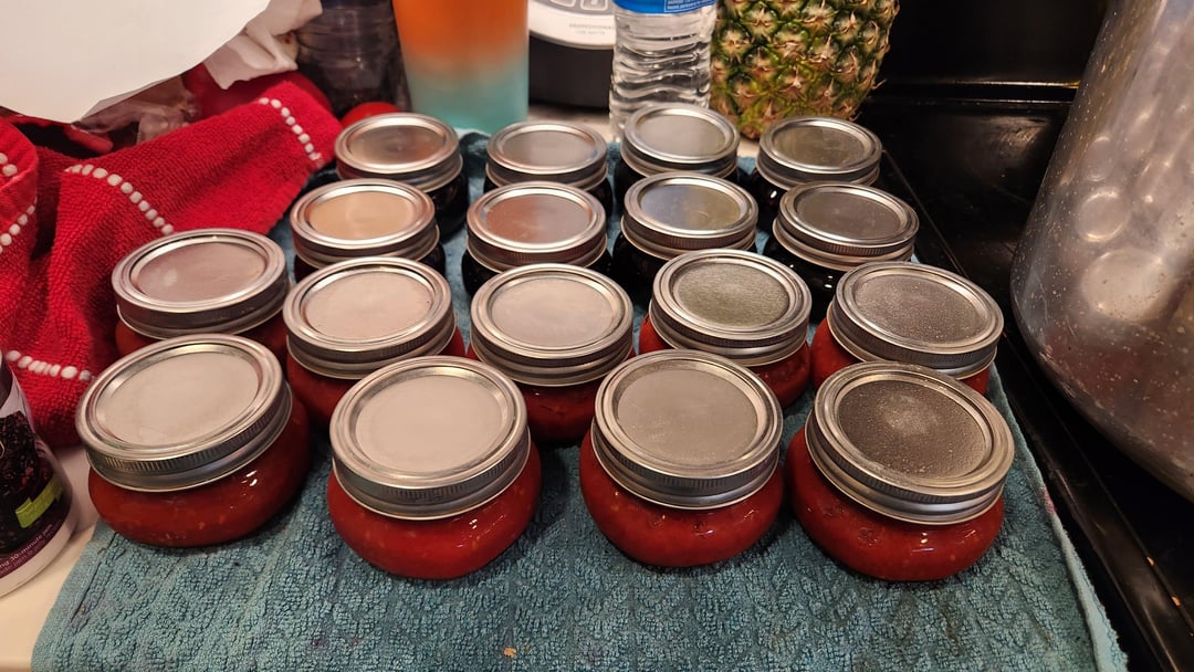 Took some breaks and turned 12 pounds of frozen 2023 tomatoes into 9 quarter pint jars of tomato paste.