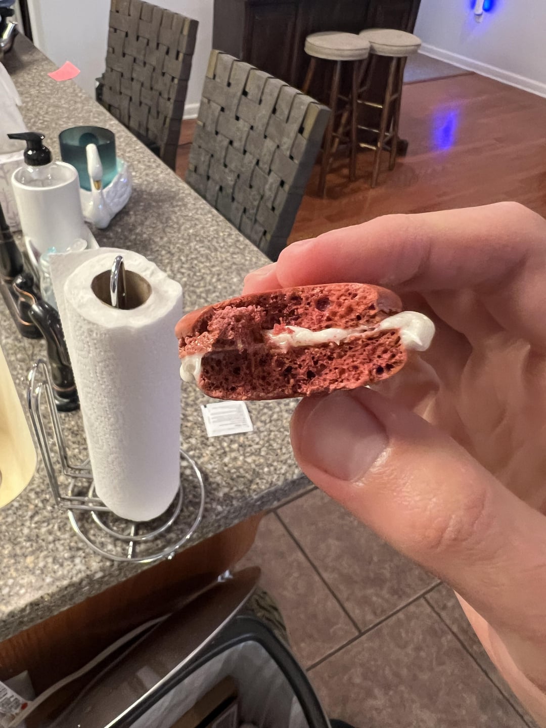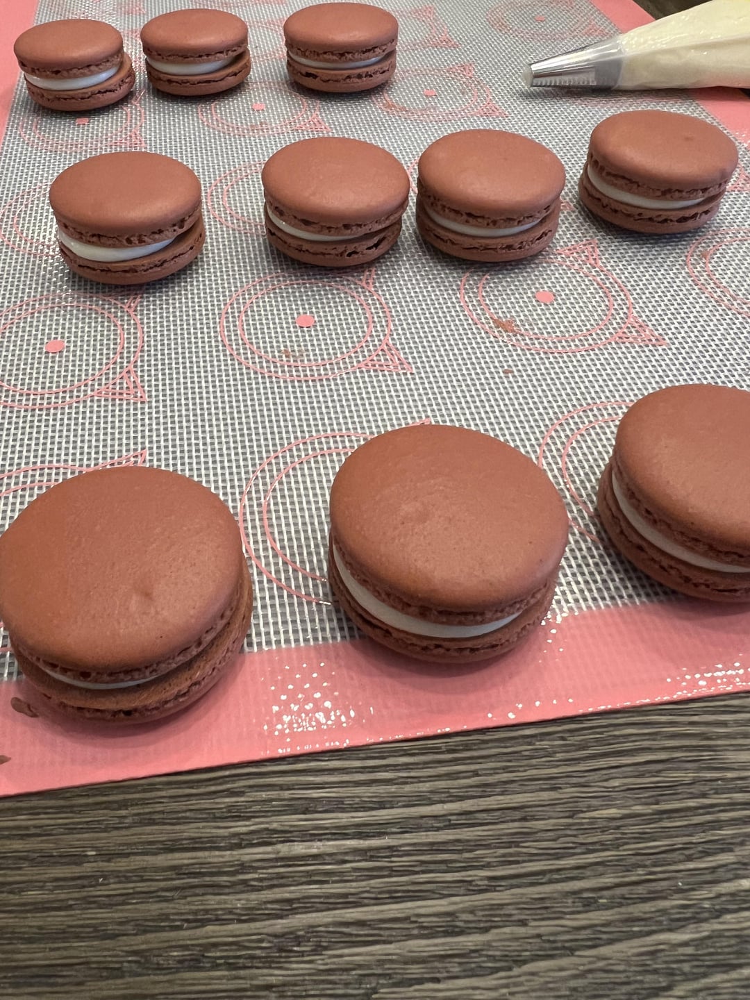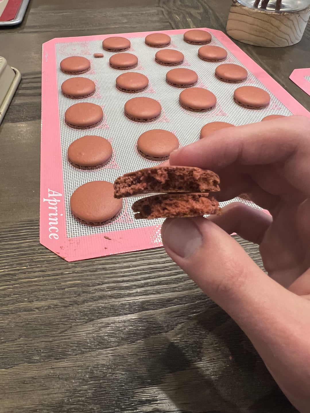 This time I used the Swiss method: ~100g egg whites, 1/4 cup granulated sugar mixed with 4g powdered egg whites, 100g almond flour and 180g powdered sugar (this ratio has resulted in good macs in the past), 1/4 tsp of cream of tartar and a pinch or two of salt. Baked at 320F (but couldn’t monitor actual temp because the probe fell, so probably higher) for 19-20 minutes. Got full shells BUT rock hard.