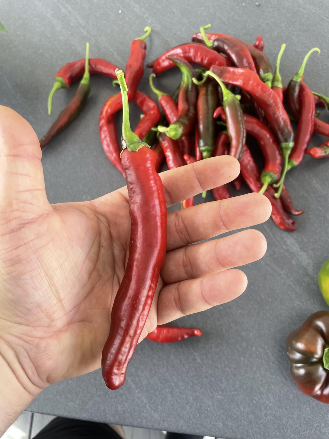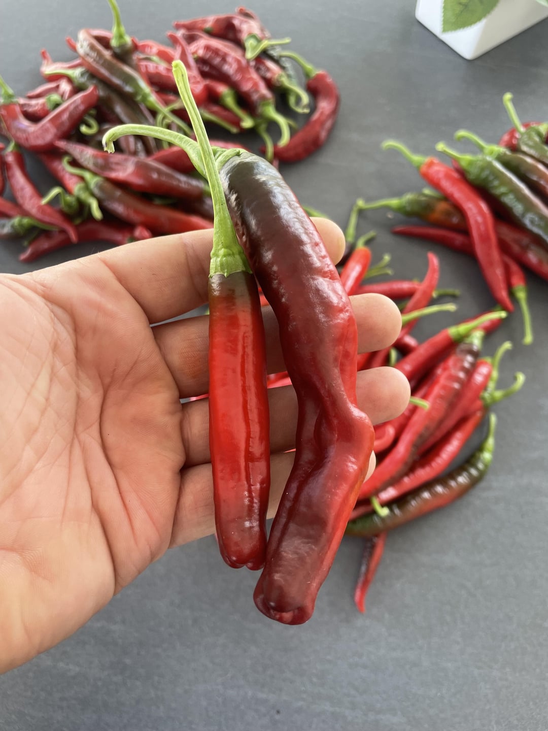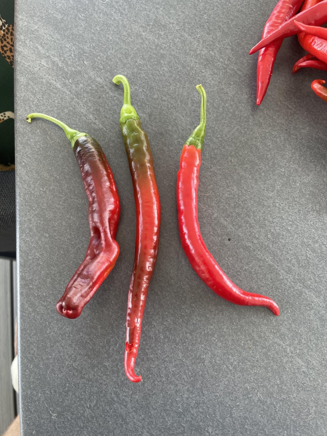 Any idea what might have happened here? Cross pollination potentially? Some of the pepper do resemble Pepperoncini peppers to a certain extent but I feel like most are to long to be Pepperoncini peppers. All the fruit you see in the pictures were from the same seed packet. I have 3 plants. 1 of them resembles Pepperoncini and the other looks more like a long skinny red pepper. Also my main issue is the taste is just weird. No spice at all and realistically eating them “green” was definitely not possible because of how bad the taste was…even now they are a little sweet but pretty bland overall and not very enjoyable fresh at least. Any ideas what I can do with them?