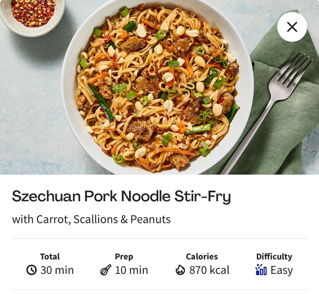 The Szechuan Pork Noodle Stir-Fry ALWAYS hits!! At this point I order it twice when it’s on the menu. Most recipes I love from HF, I just replicate but I feel these ingredients are so specific, I feel like it can’t be replicated.