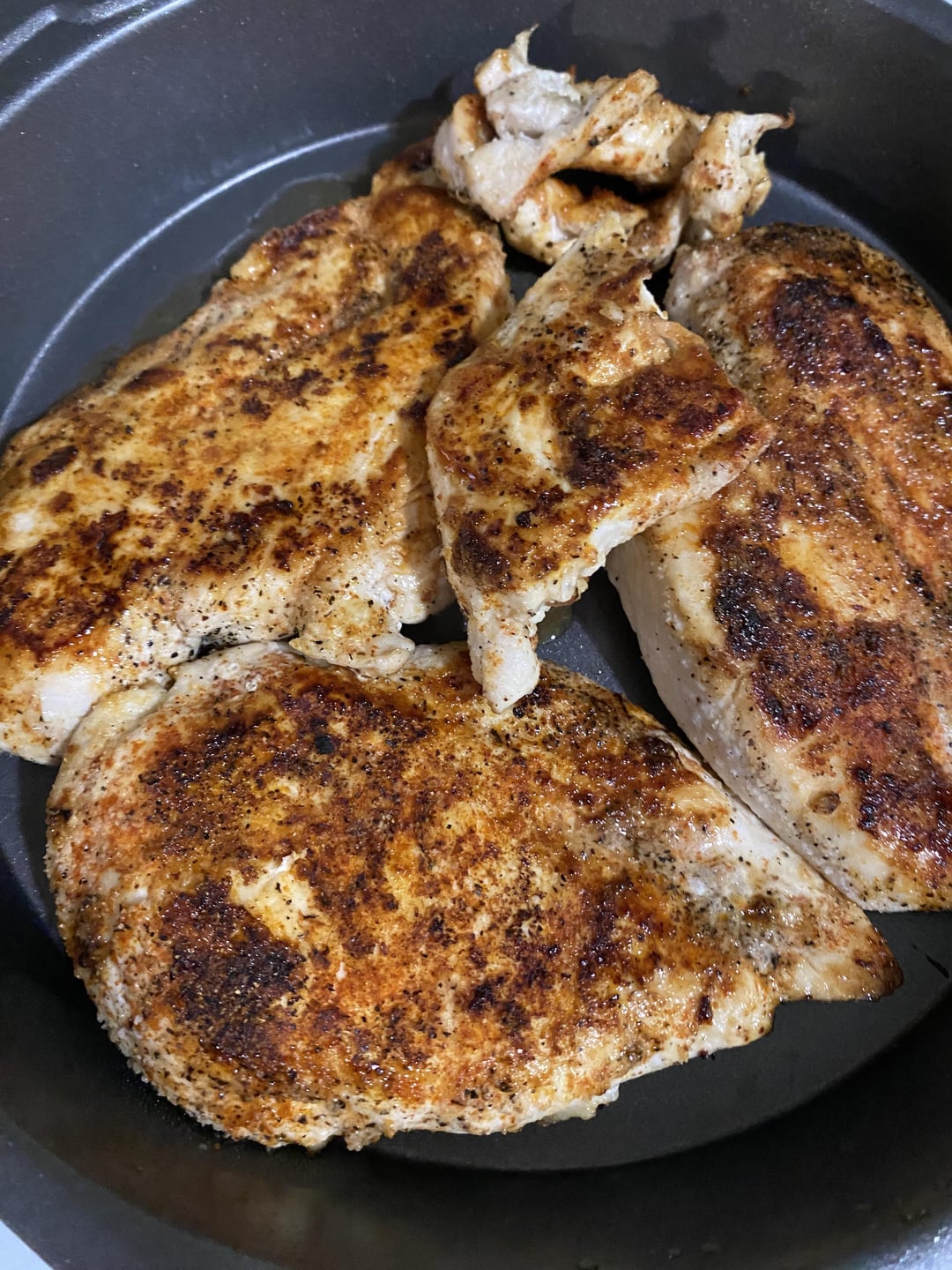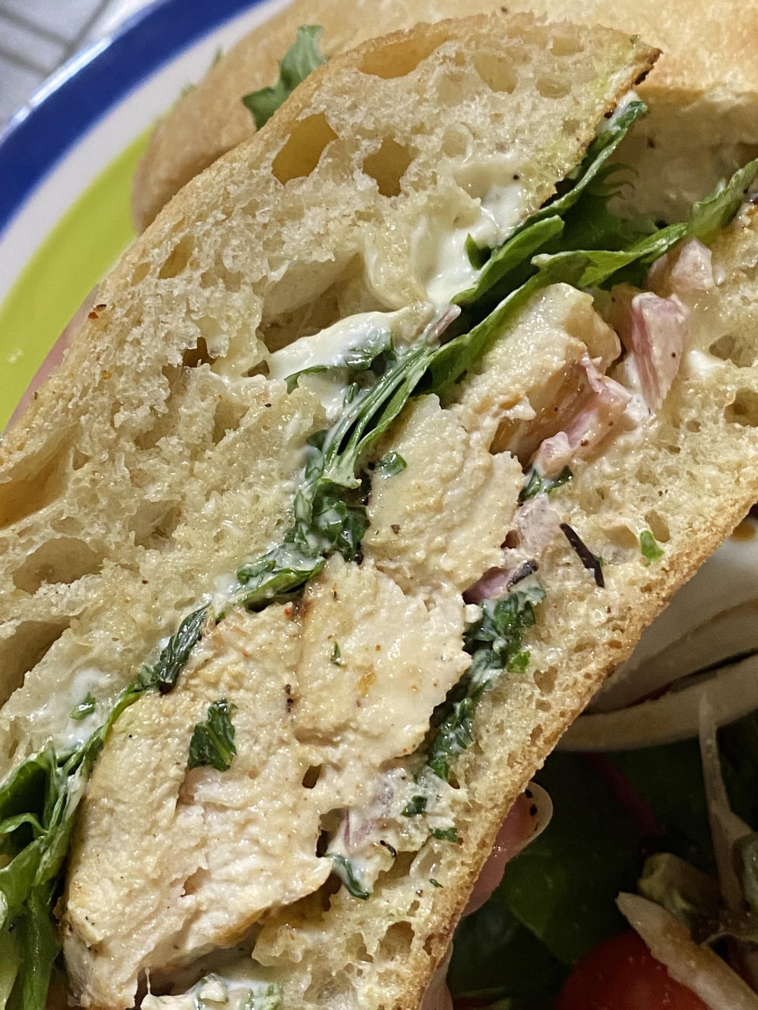 Homemade pickled red onions, basil mayo, balsamic vinegar, greens, and blackened chicken breast served with a side salad