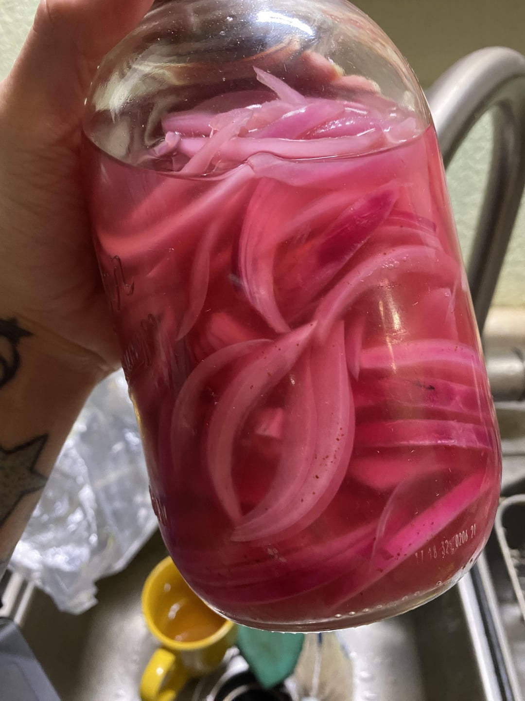 I wanted to share the pickled red onion recipe because it’s ridiculously easy: