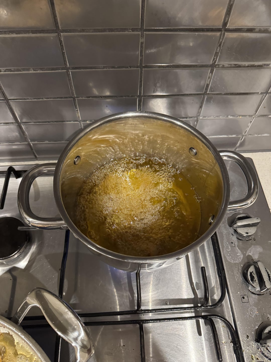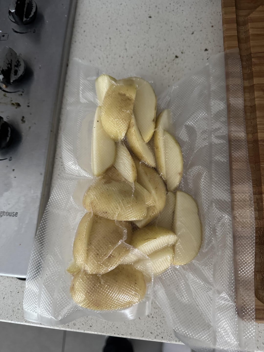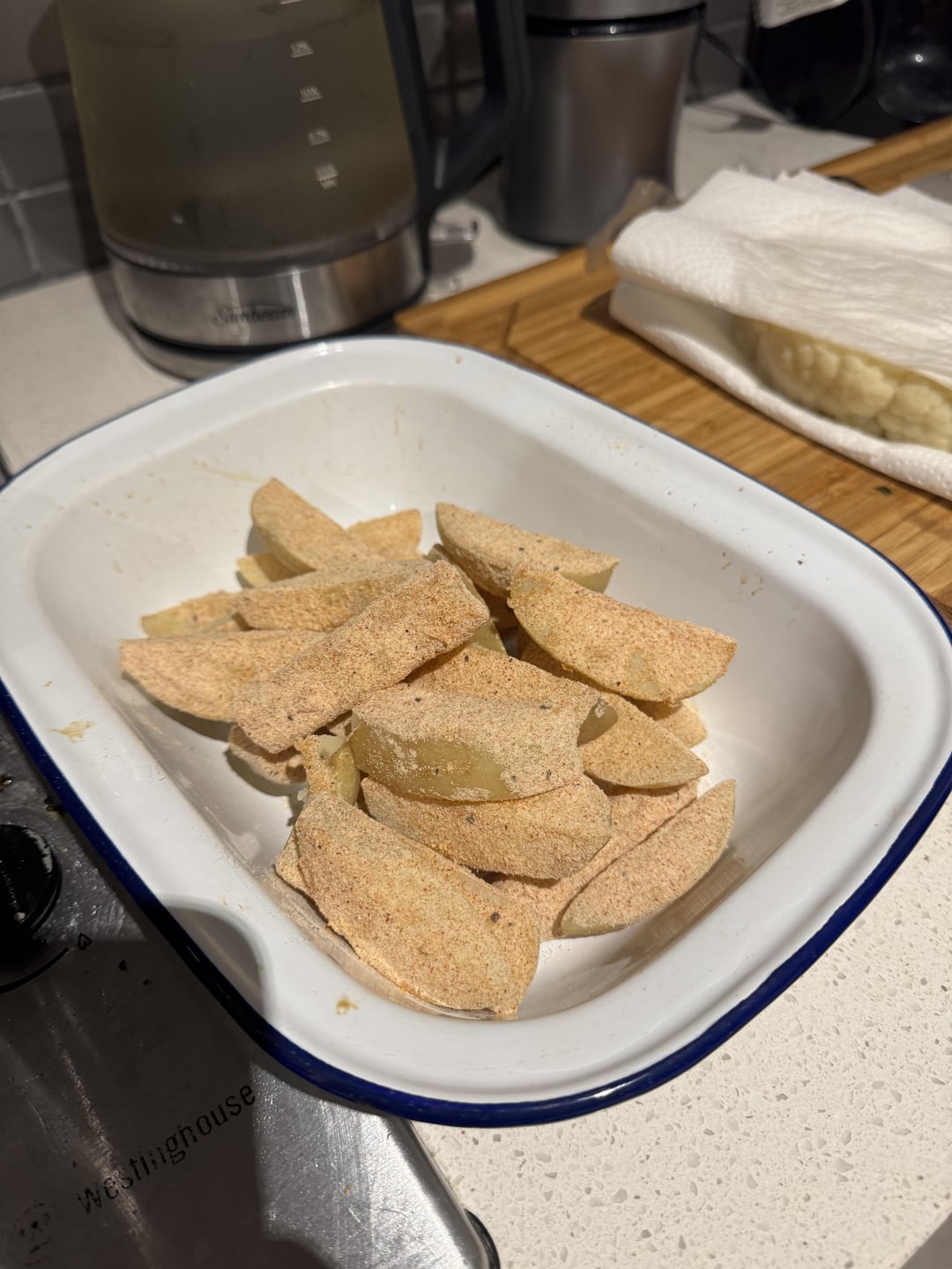 Wedges go in for 40 mins at the same temp. Remove, coat in flour + seasoning, deep fry hot until crispy.