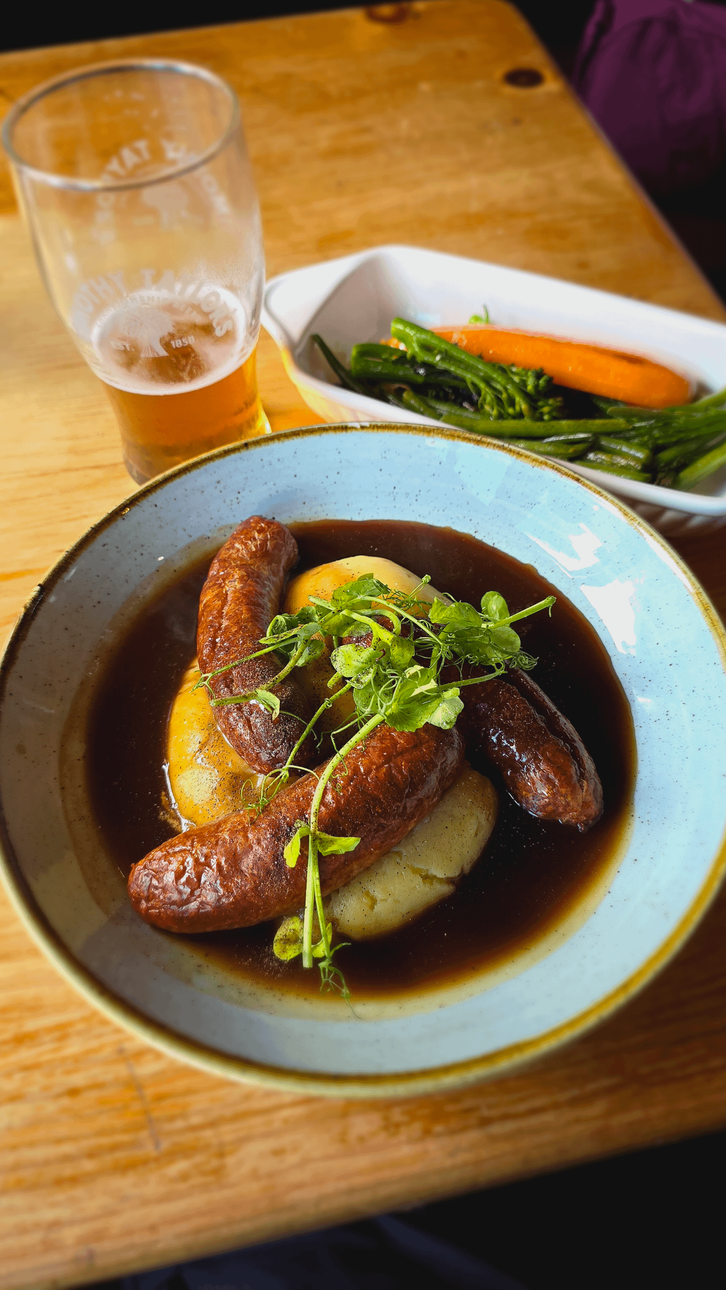 Courtesy of Three Tuns Inn in Bishops Castle. Their pale ale at the back too. The sausages looked a little bit overdone when they came out but they were moist and cooked perfectly inside. Good stuff.by FreezerCop Write A CommentYou must be logged in to post a comment.