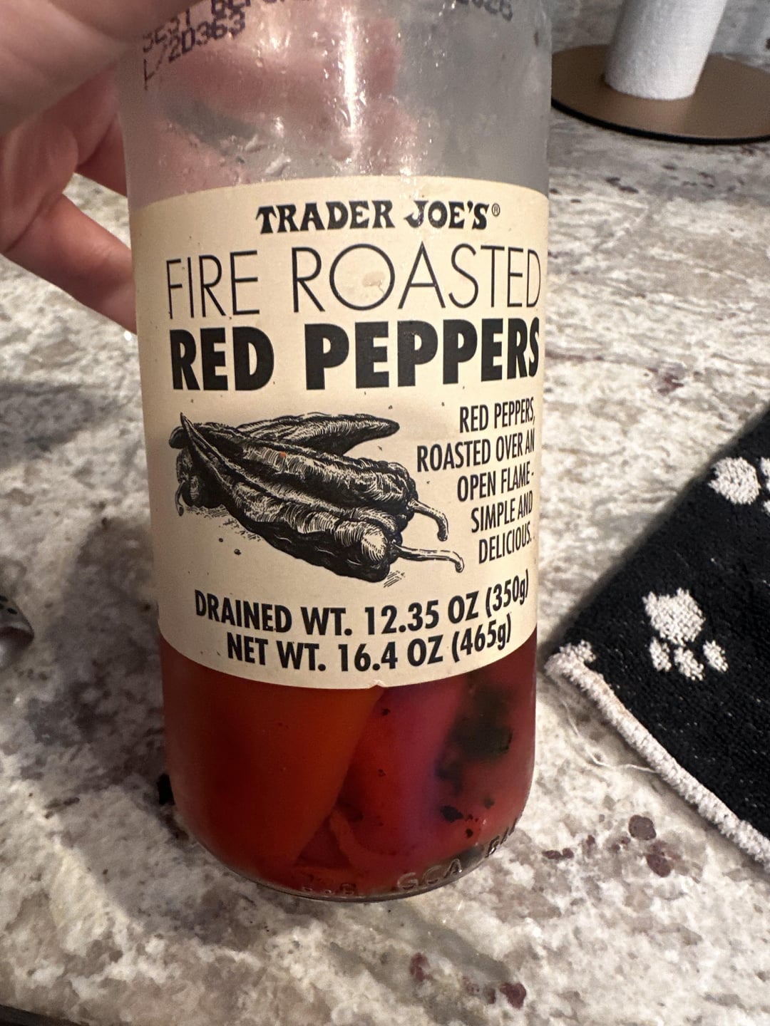 Well my red bell pepper was freakishly soft and about half a cup of water came out when I cut into it, but thankfully a jar of roasted red peppers I’ve been needing to finish up awaited me in the fridge!