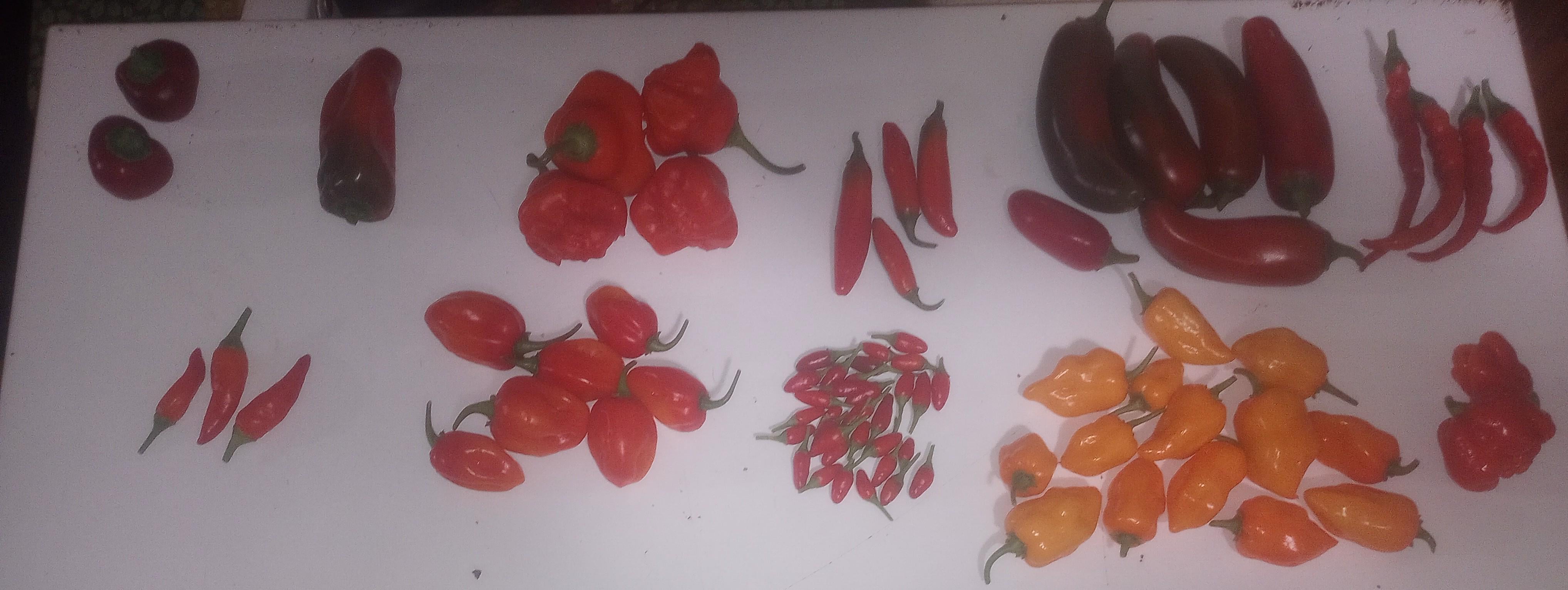 From top right, ranging from mild to wild, hot cherry, sweet heat, mad hatter, serrano, poblano, cayenne, super chili, primero red habanero, Thai dragon peppers, orange habanero, Armageddon peppers.
