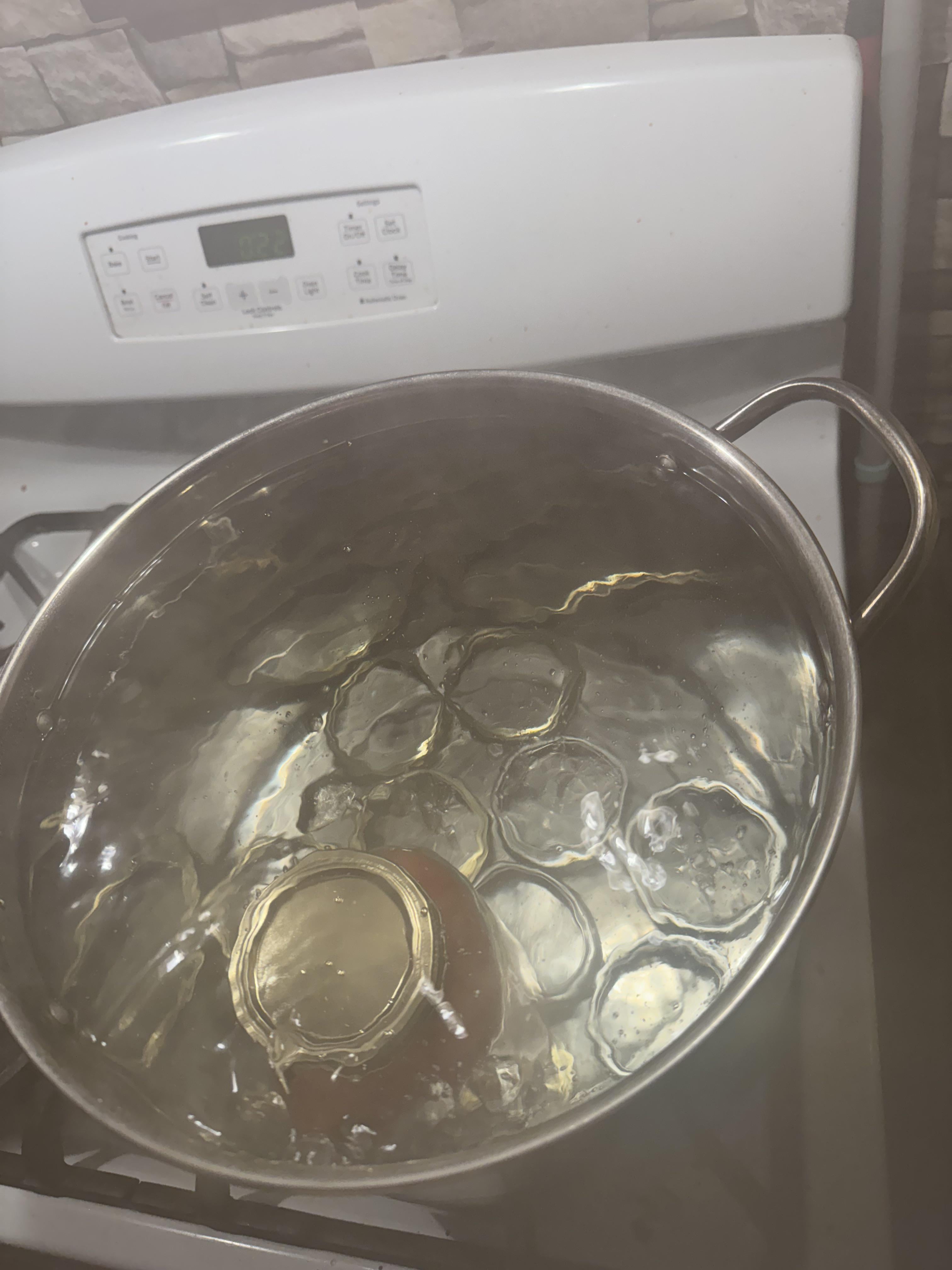 Used this recipe to make crushed tomato’s. This is the biggest pot I own and it’s almost over flowing and I had to use the rings from the other cans I have to raise up the can. I’m going to the flea market Saturday morning to look for a bigger pot with a rack in the bottom. I used 6 pounds of tomato’s and it made a quart of crushed tomato’s with a little bit of juice left over.