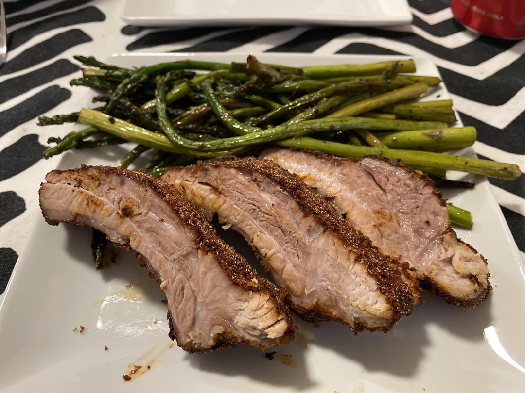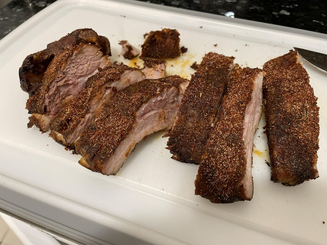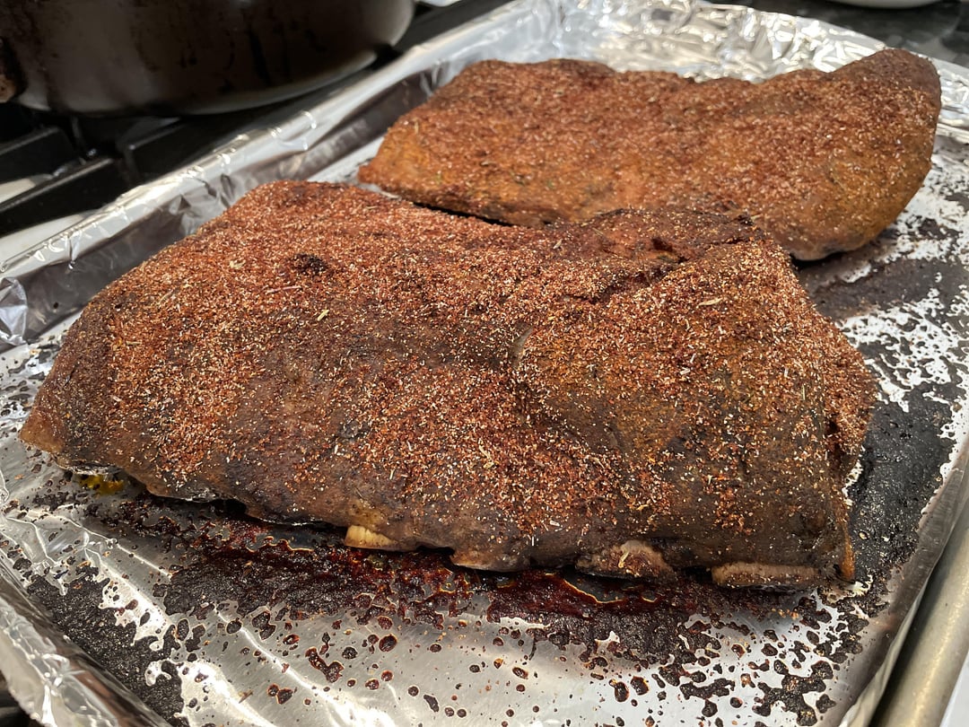 Dry rub, then a bath for around 5 hours at 162. Hit with a little extra rub and then roasted in the oven for 10 minutes at 450 to set a little bark.