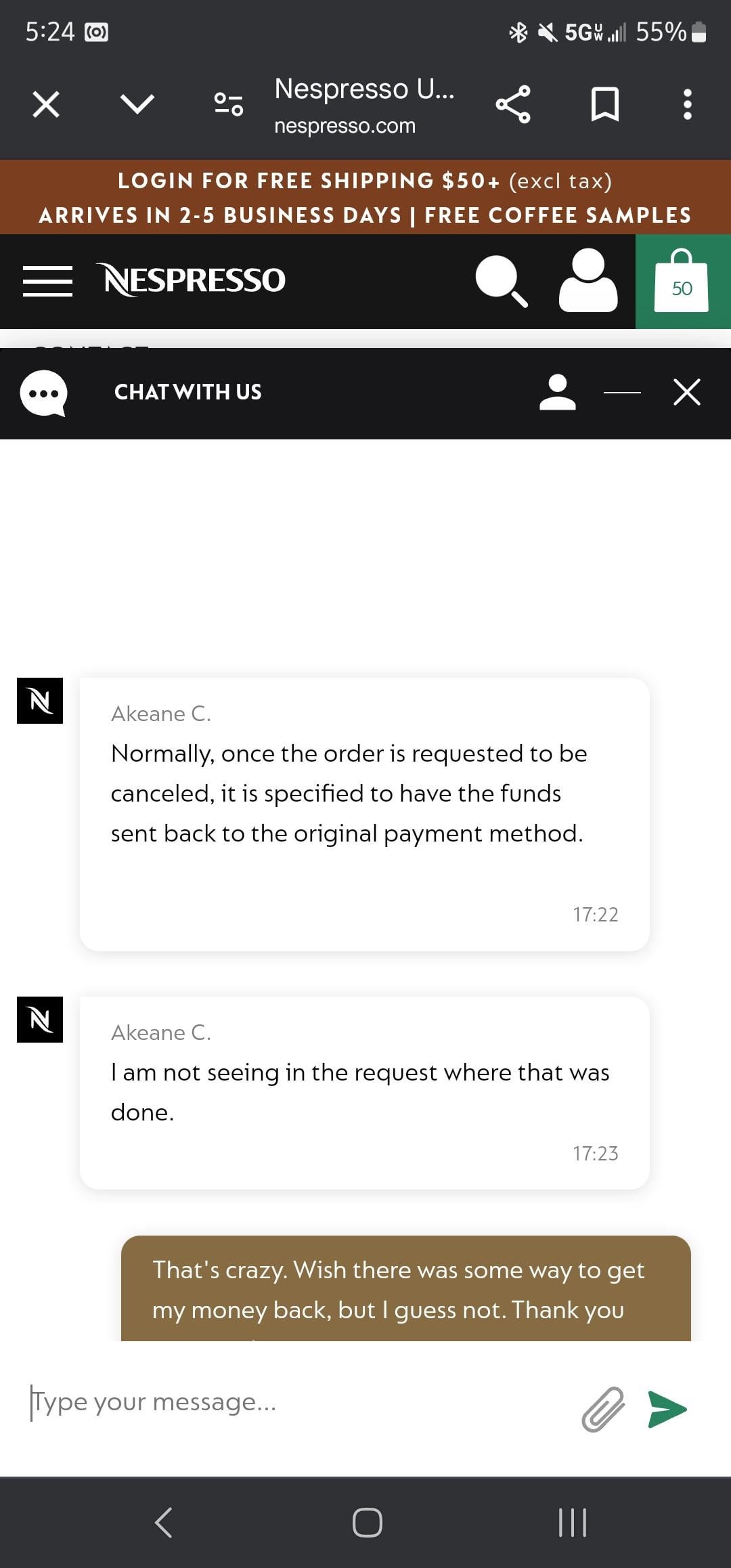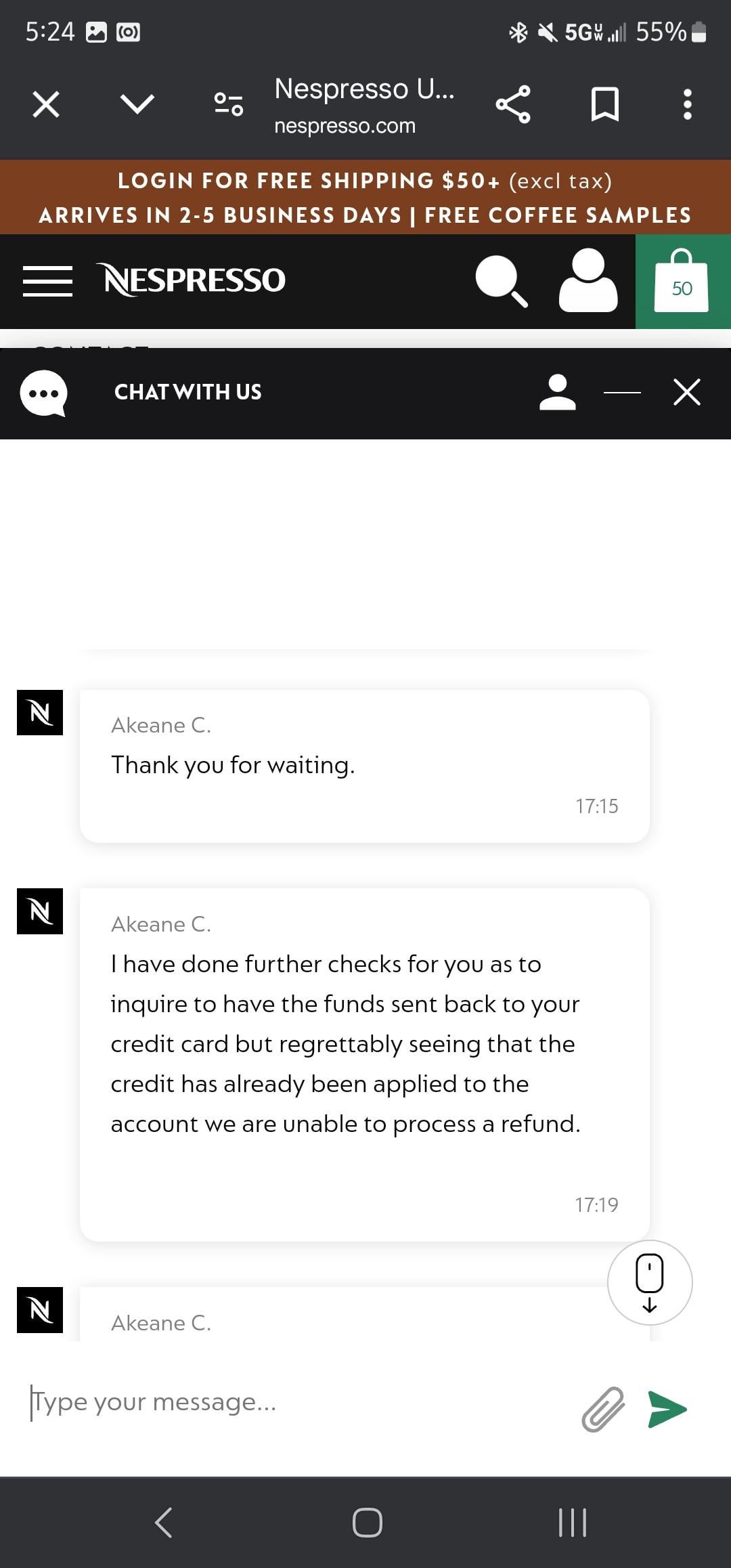 I asked a week ago for an order to be canceled and was assured that my refund would be given within a week. I just noticed that my account has a credit for the same amount and this was the response. I want my $250 back and not in credit towards future purchases. Guess everyone is getting Nespresso themed Christmas presents this year.