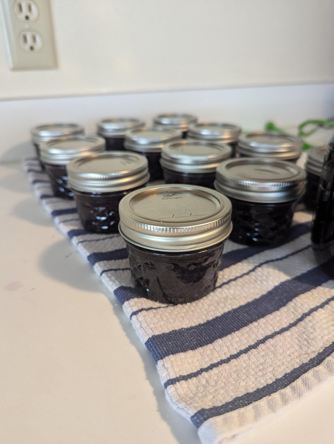 I’d advise you to use the pint jar first because jams and jellies are normally canned in 1/2 pint are smaller (and processing times are provides for those sizes unless it specifically allows for larger). That one may be under-processed since there is so much more volume of contents.