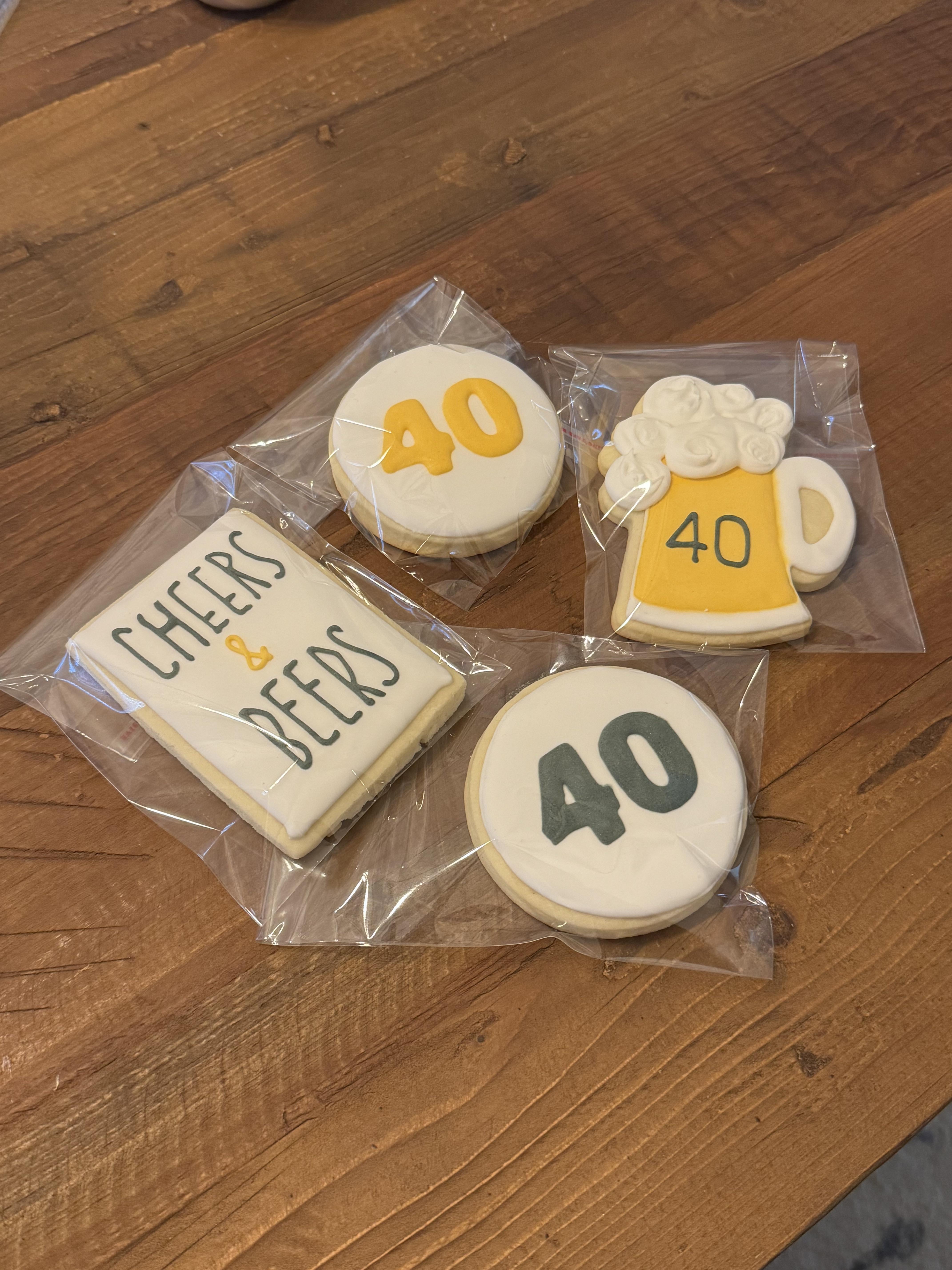 Something that I like to do that’s super simple is put a simple line border around the cookies. Like a yellow one around cheers and beers and the opposite color border around the circle ones. It’s simple but makes the cookies pop.