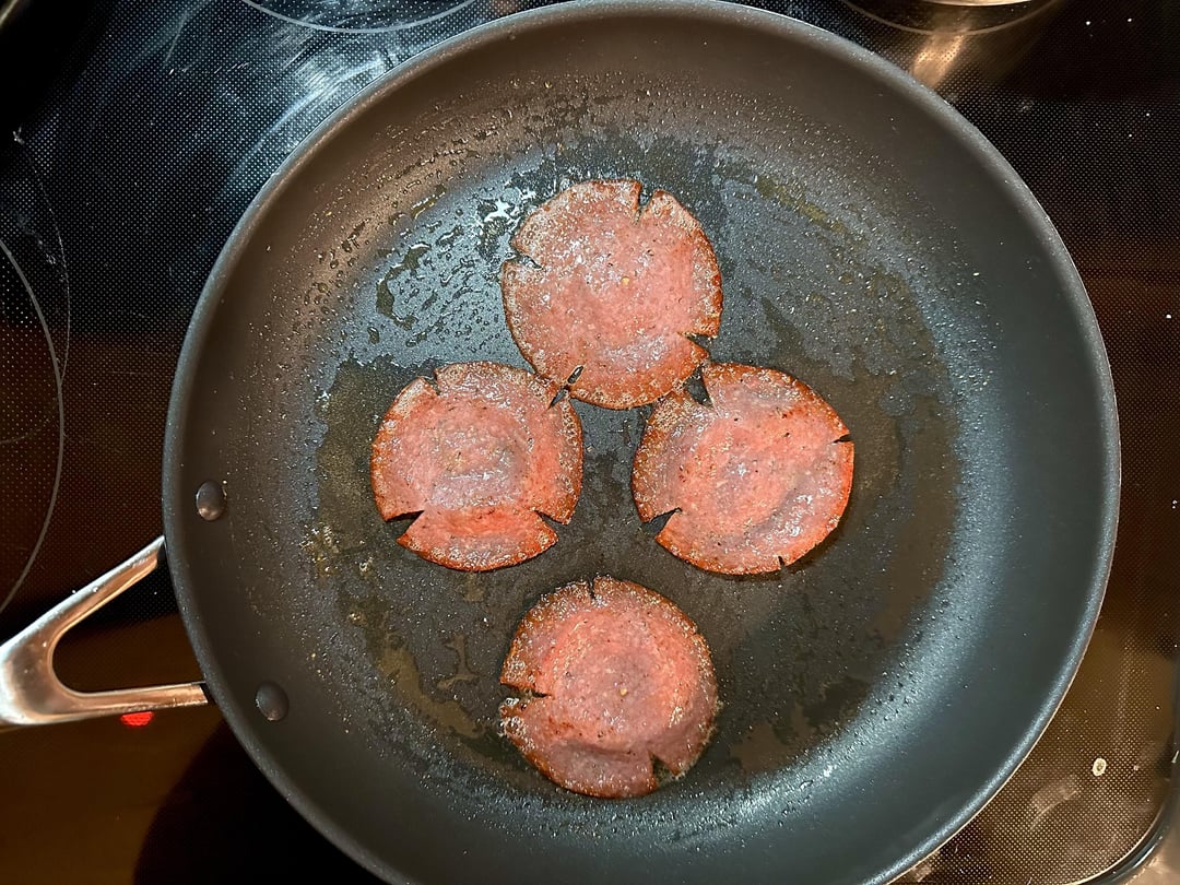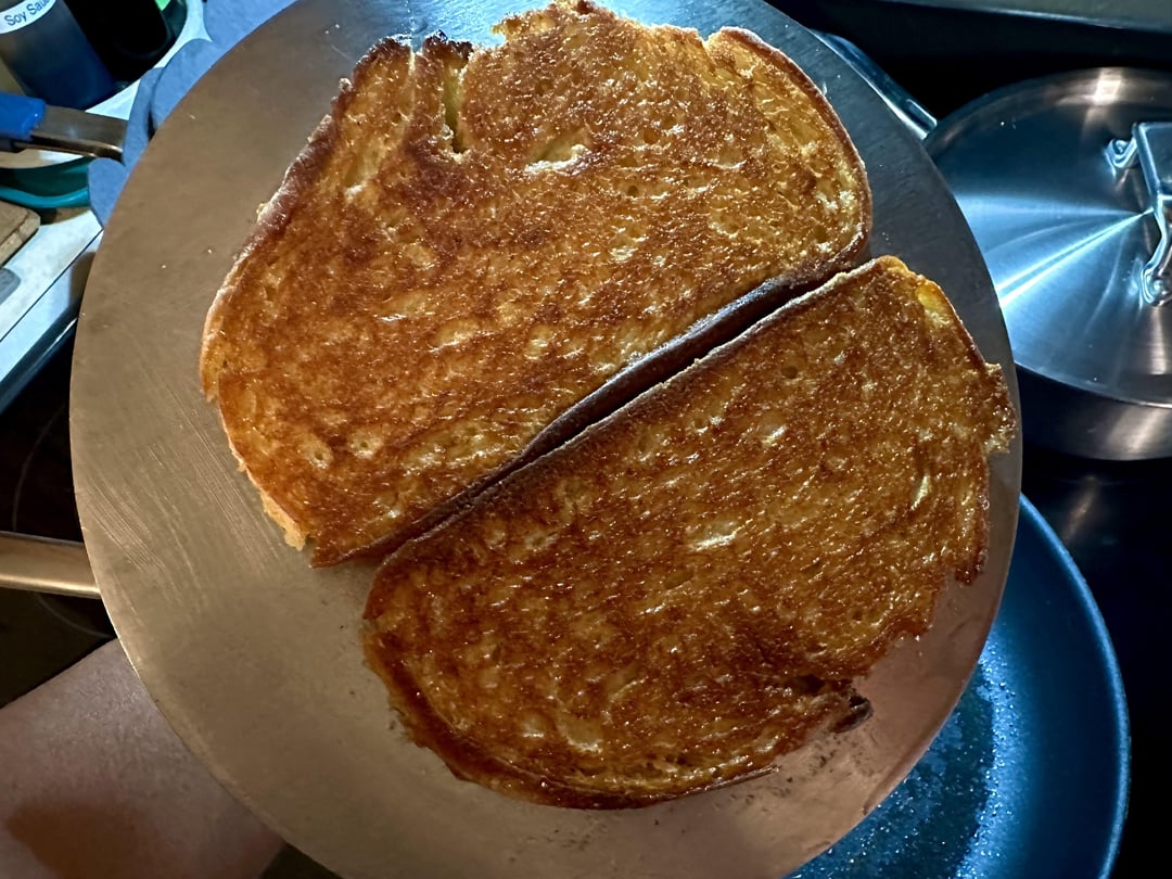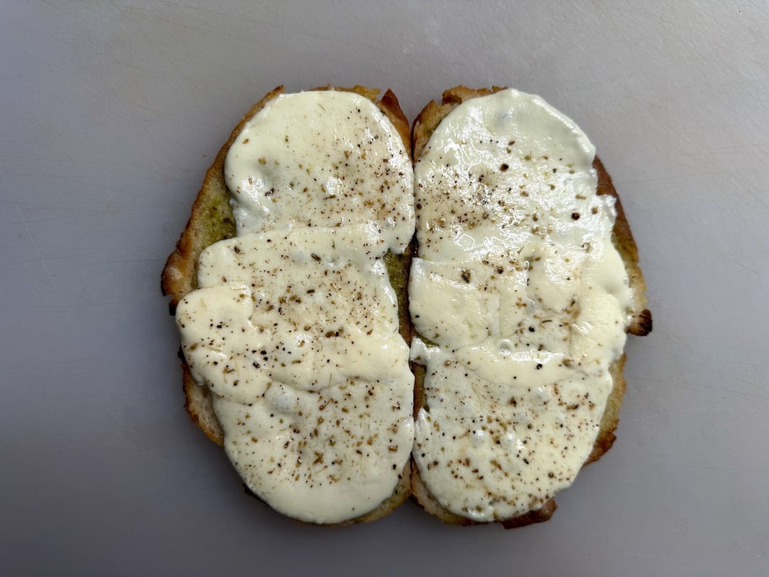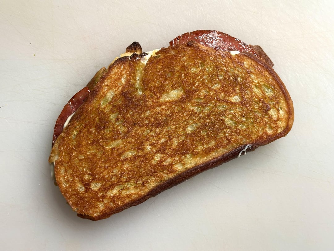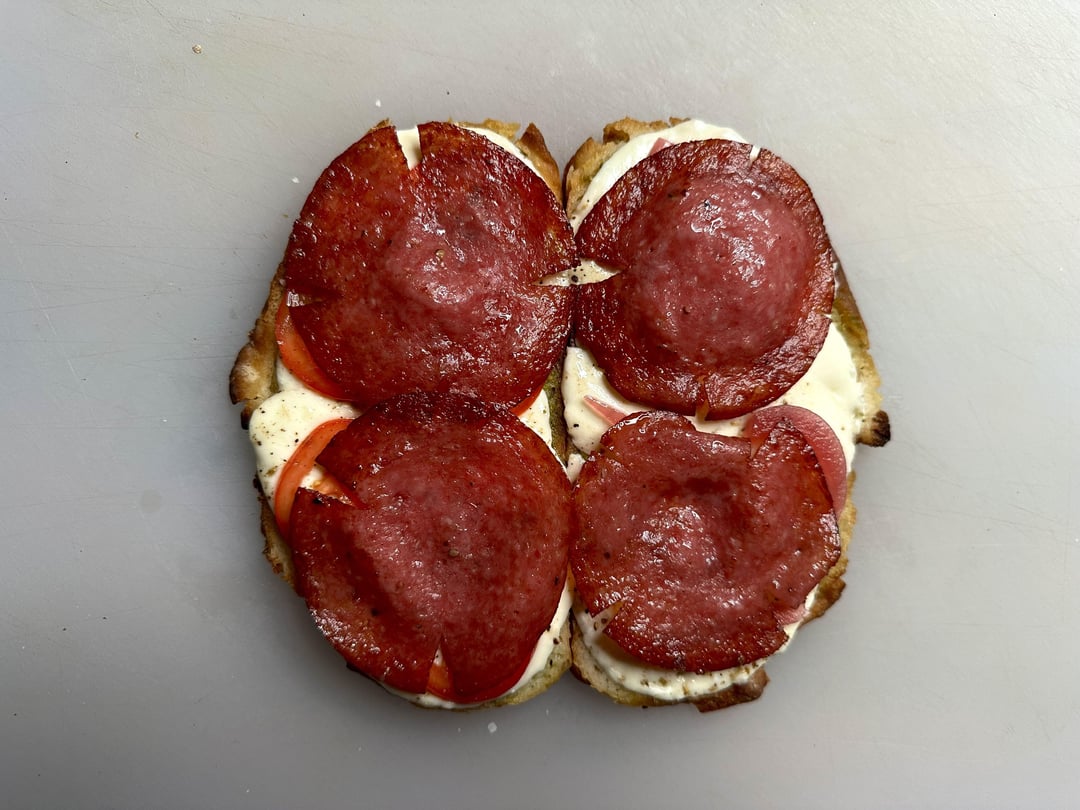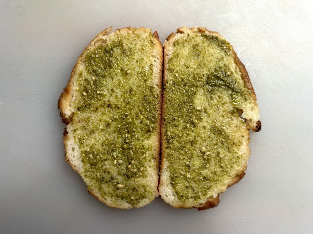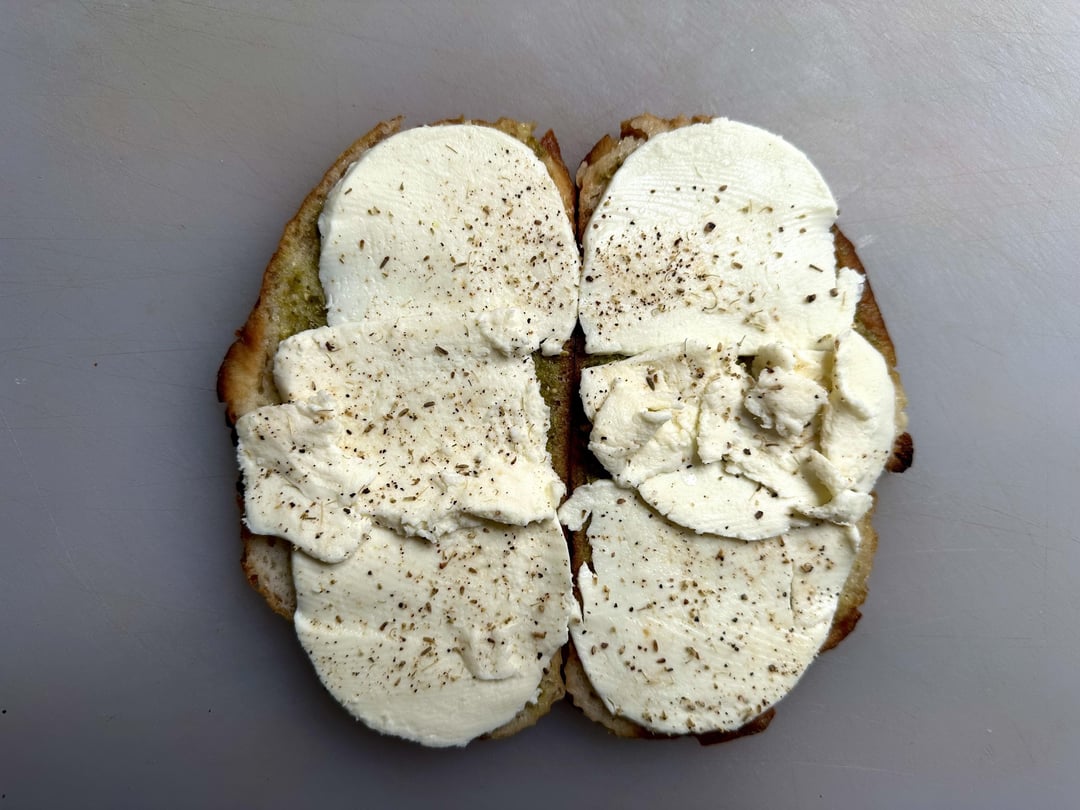 Italian country white bread with lots of Kerrygold butter, pesto, fresh mozzarella seasoned with salt, pepper, and fennel pollen, sliced Campari tomato, pan fried Genoa salami, and pickled red onions.