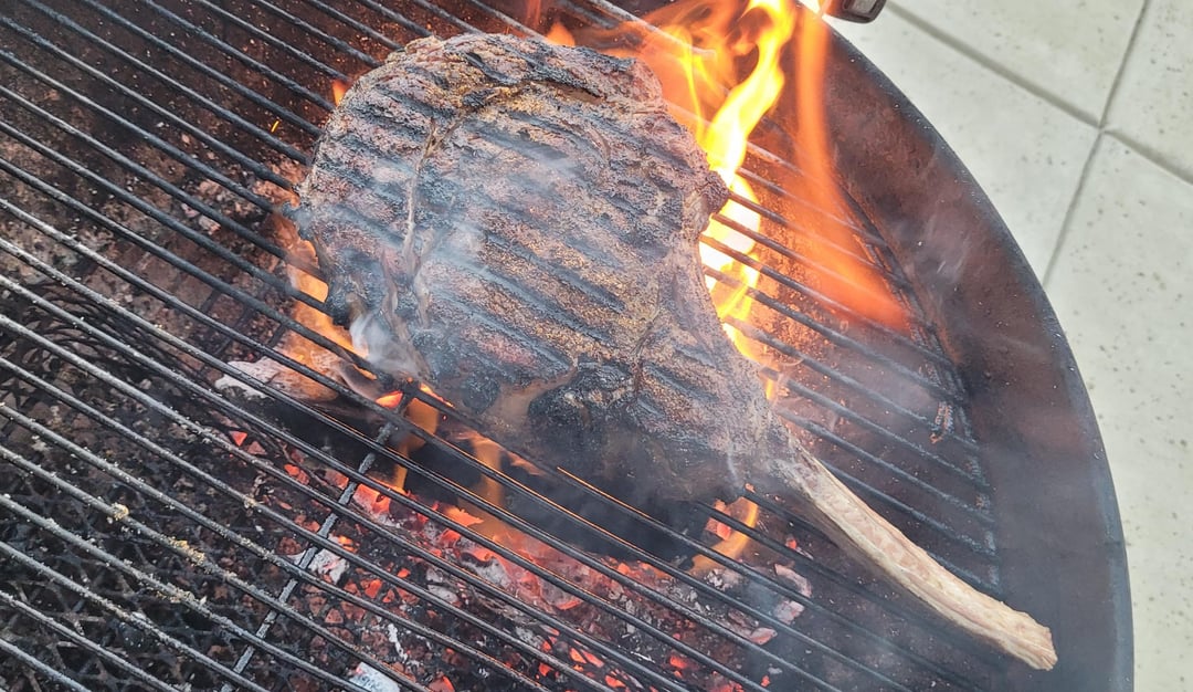 Highly recommend doing a crosshatch style sear for a prettier grill pattern, so align the bone diagonally across the grill rack for half your sear time on one side, rotate 90° on the same side to finish the sear and repeat on the other side so you have a beautiful x-pattern on your meat!