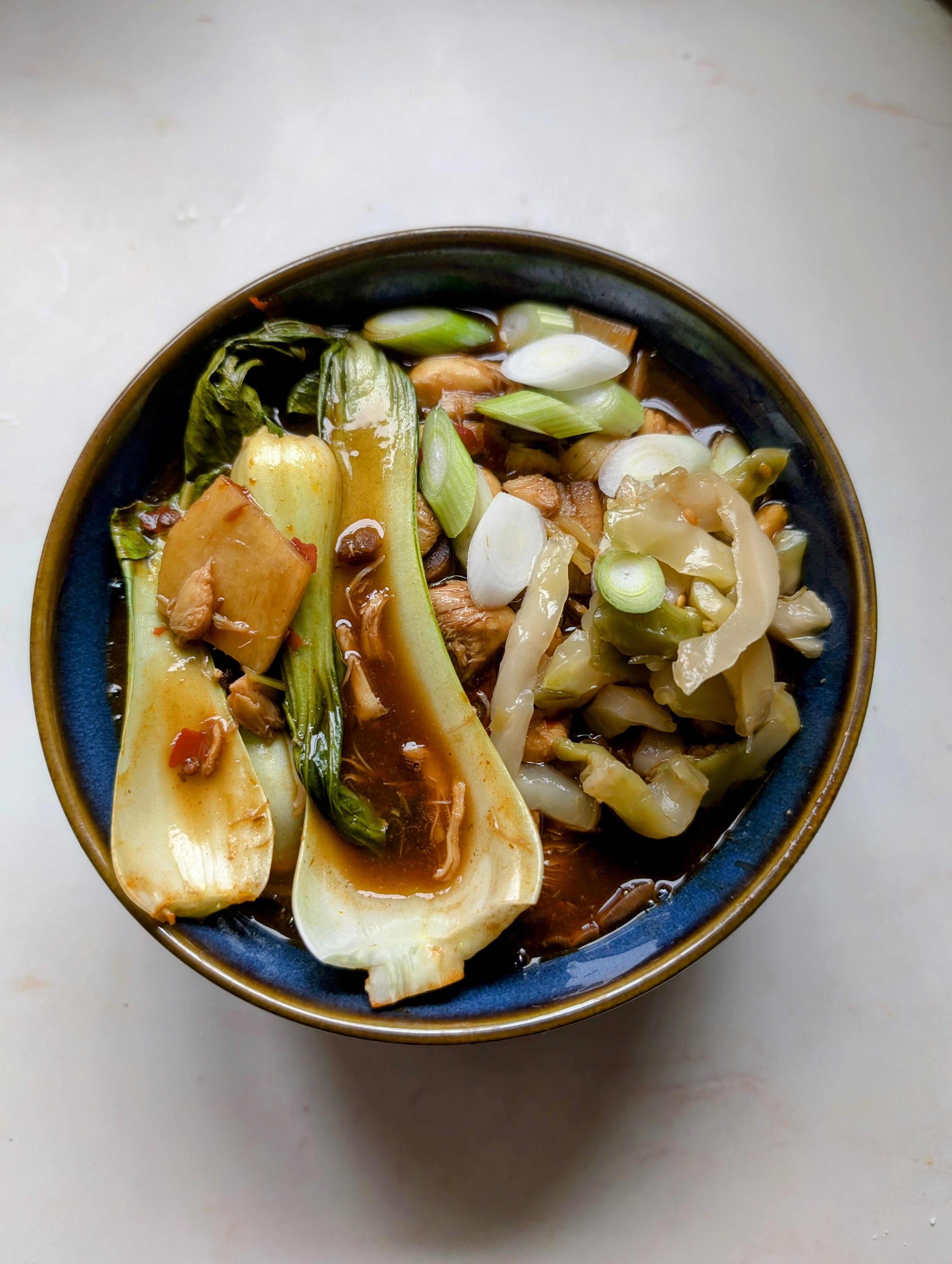 Recipe here, made a few adjustments. Used proper Chinkiang vinegar, added crab meat, bamboo shoots & pak choi, topped with pickled mustard tubers & sliced spring onions. I also fried some cassia, star anise & Szechuan peppercorns with the dried chillis.