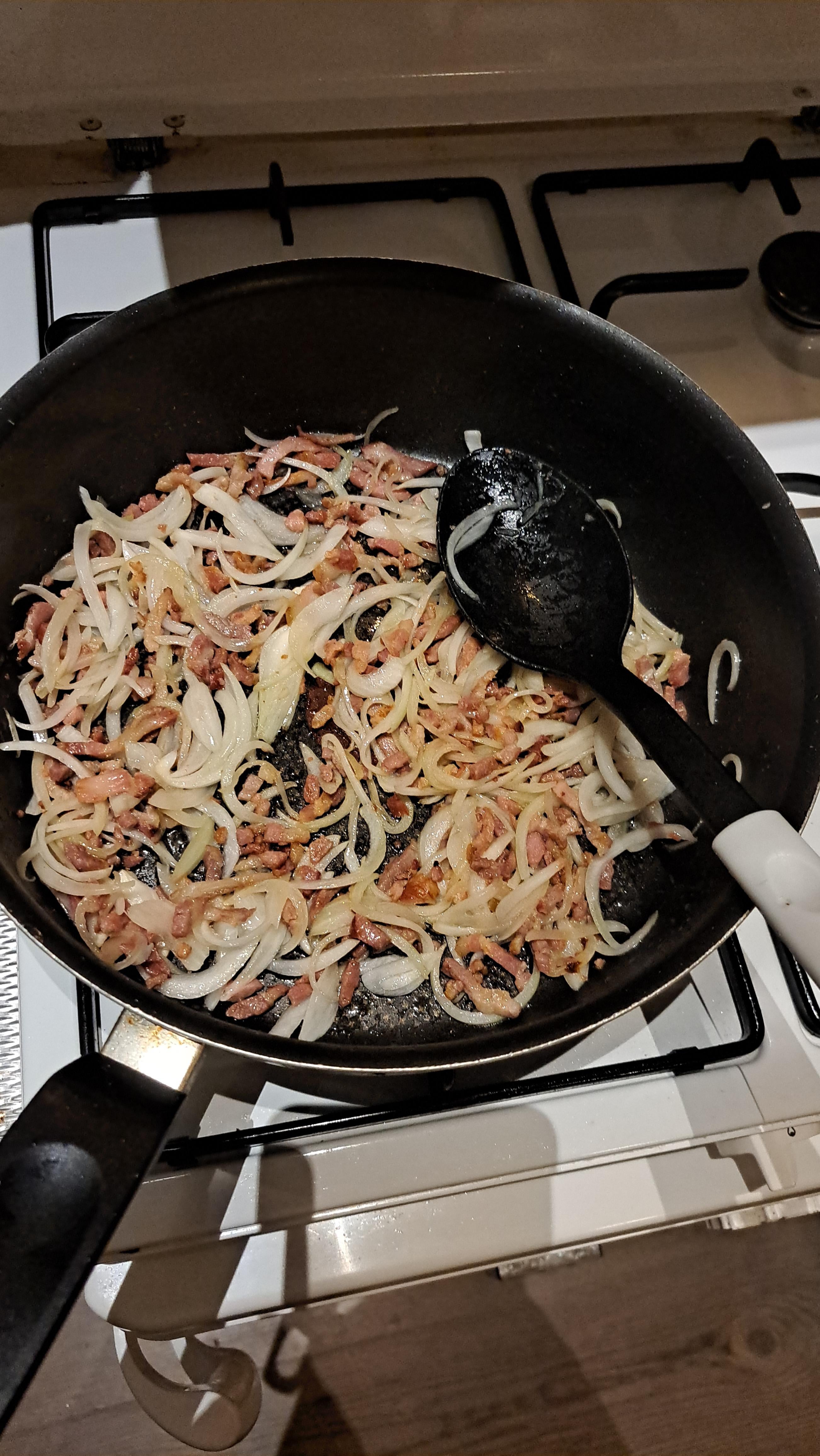 I cook the bacon all the way, remove the bacon from the pan, and toss the onions in the bacon fat. Fucking phenomenal taste 🤌