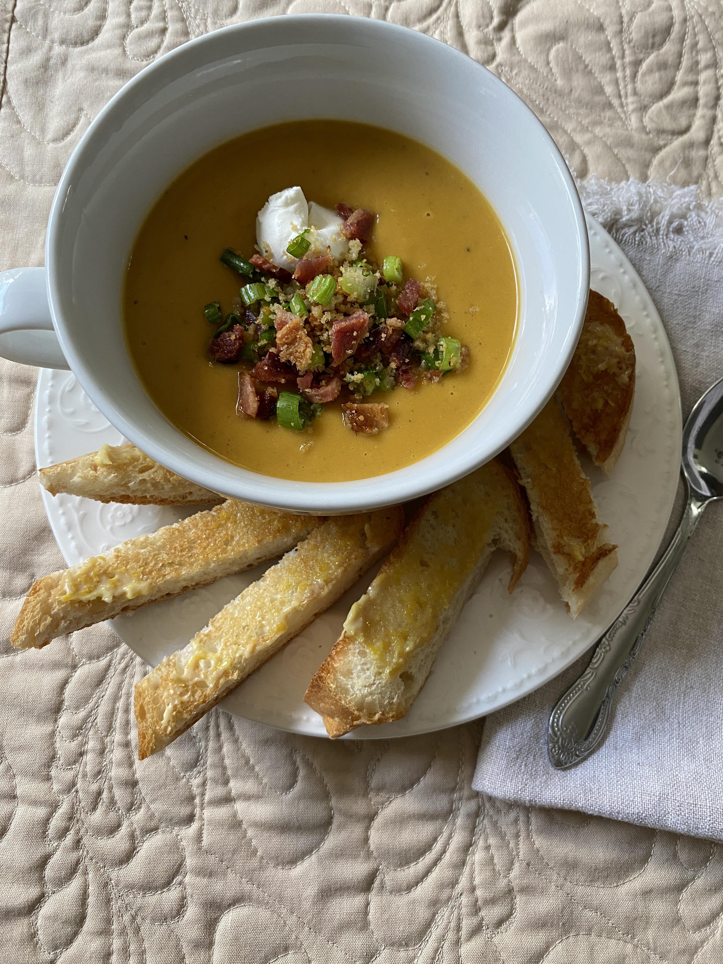 I made this soup for lunch today and it was outstanding! I cut the toast into sticks to fit my plate. I never would have considered a lemon rind & garlic butter would pair well with this soup but it was delicious. I'm going to make this soup, which is more of a bisque, as a starter before Thanksgiving Dinner. Delicious!