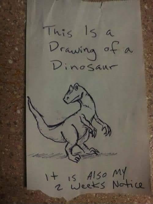 If you guys ever get the chance to get out, take it. If you decide to stay in and pursue it, give it your all and keep the world turning 🌎 by Danger_Ranger1990 9 Comments Distant_Congo_Music 1 year ago That’s a great drawing tbh bec_on_pluto 1 year ago good ass drawing wtf YourDeathIsOurReward 1 year ago u/repostsleuthbot ChemistVegetable7504 1 year ago This is one of the best “2 weeks peace out people “ I’ve seen. Kudos for the drawing! GL! subtxtcan 1 year ago Dude, that’s a great dinosaur.I guess 2 weeks till the asteroid now? meatsntreats 1 year ago This is all I want when people are leaving on good terms. Go live your life and leave me a great picture. Unusualshrub003 1 year ago I turned in my two week notice in a sympathy card. CompetitiveRub9780 1 year ago Going to art school I c nottomelvinbrag 1 year ago Id hate that you’ve leftWrite A CommentYou must be logged in to post a comment.