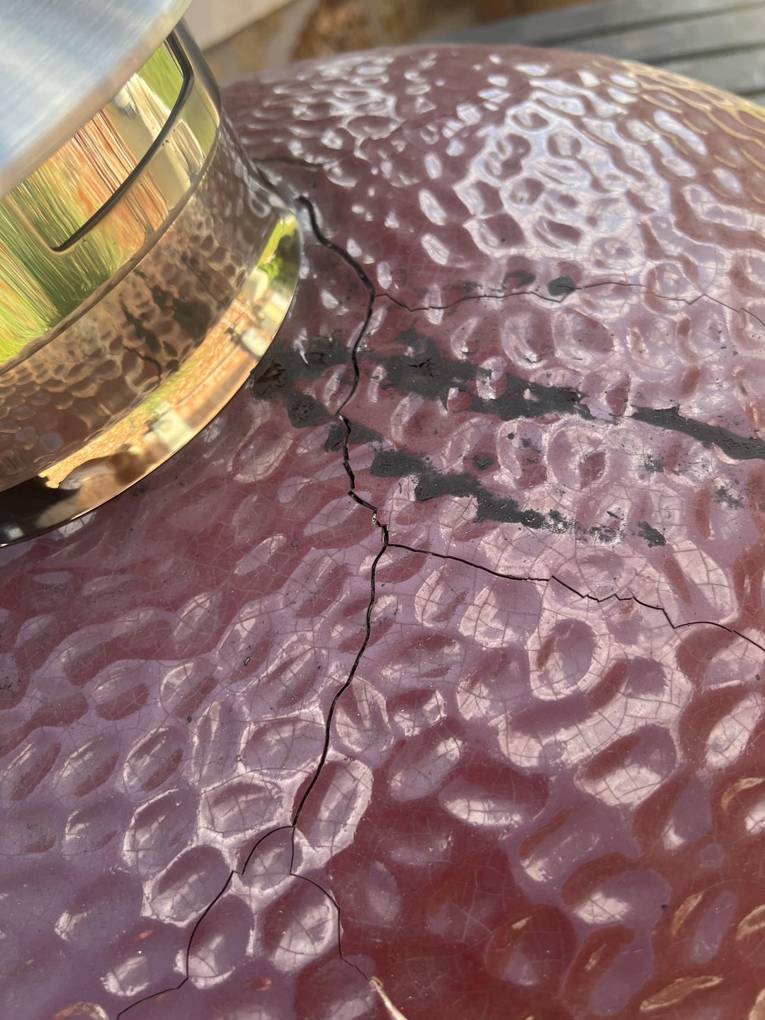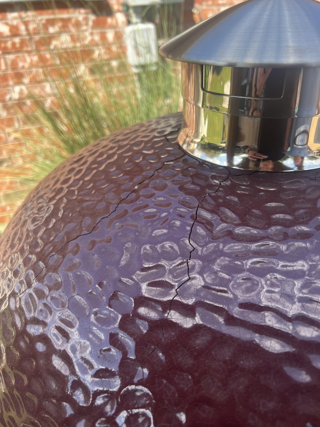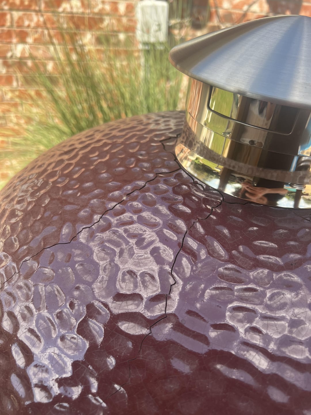 You got it too hot and I see you are running an aftermarktet chimney. To me, two cracks going to the chimney is telling. But bottom line, you got it way to hot. As others have said, nothing good can come from a cook that hot.