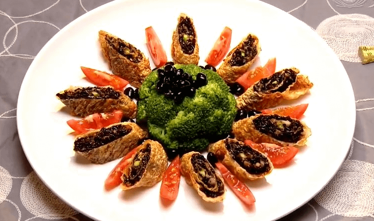 1. Cook the purple rice according to package instructions. 2. Finely chop the celery, preserved radish, and water chestnuts. Cut the broccoli into florets, blanch them, and soak them in ice water. 3. In a pan, stir-fry the preserved radish, water chestnuts, and celery until fragrant. Add the cooked purple rice and season with the vegetarian oyster sauce, salt, and sugar. Add the potato starch-water solution and stir well to combine. 4. Place the purple rice mixture and asparagus sticks on the tofu skin sheets. Roll them up and seal the edges with batter. Deep-fry the rolls in hot oil until crispy and golden brown. 5. Invert a bowl of broccoli florets onto a platter. Slice the purple rice rolls and arrange them on the plate. Decorate with tomato slices and black soybeans.