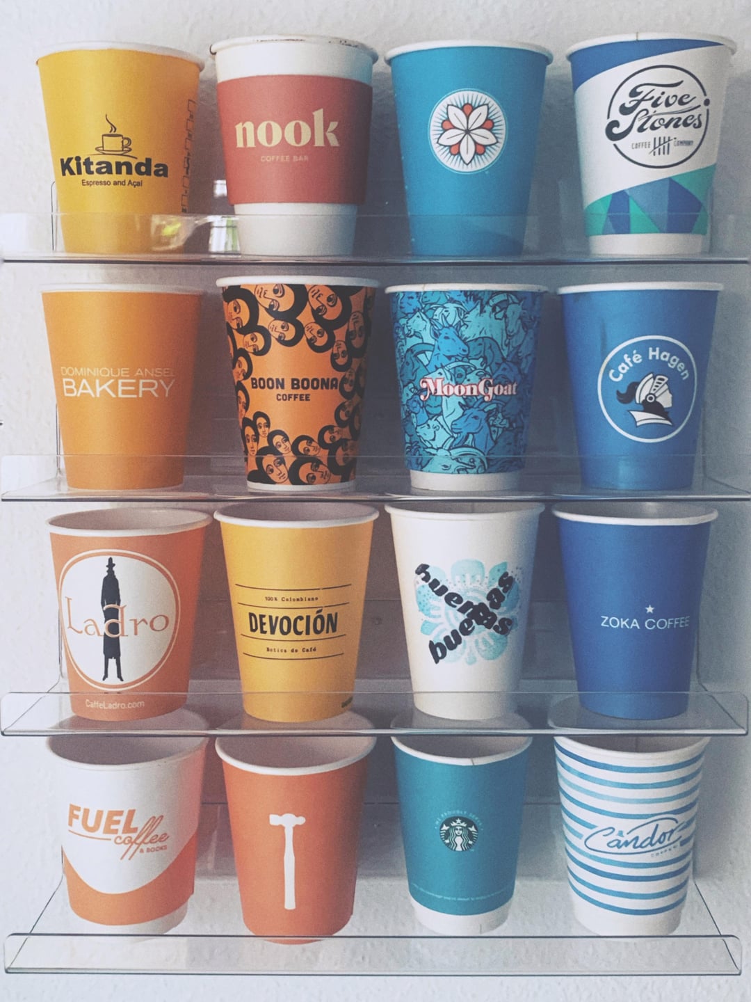 I have four clear acrylic shelves above my pourover station that I use to display to-go cups from the shops I’ve visited over the years. Here’s what’s on display this week— a nice set of contrasting blues and oranges/yellows. Have a great day everyone!