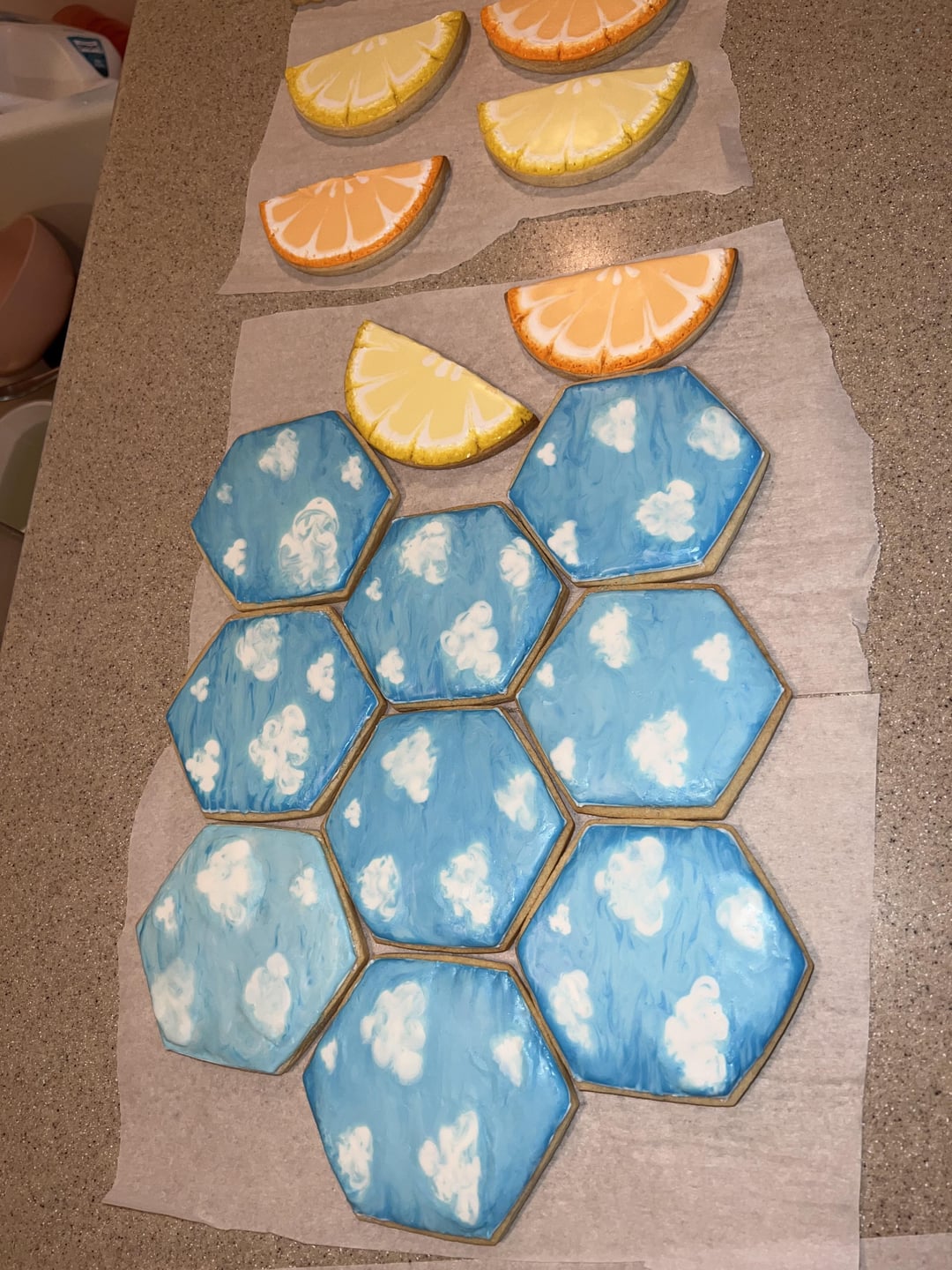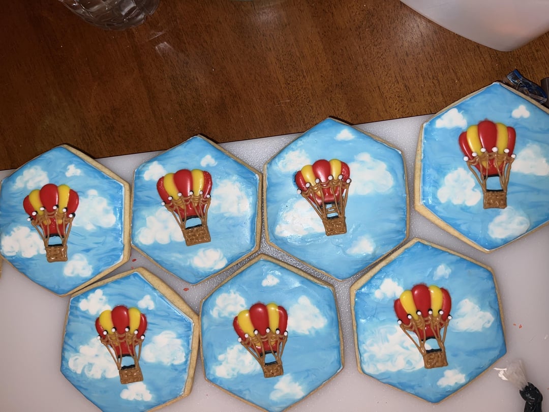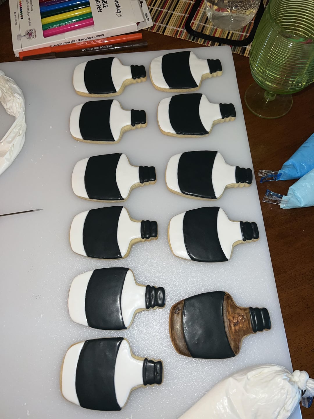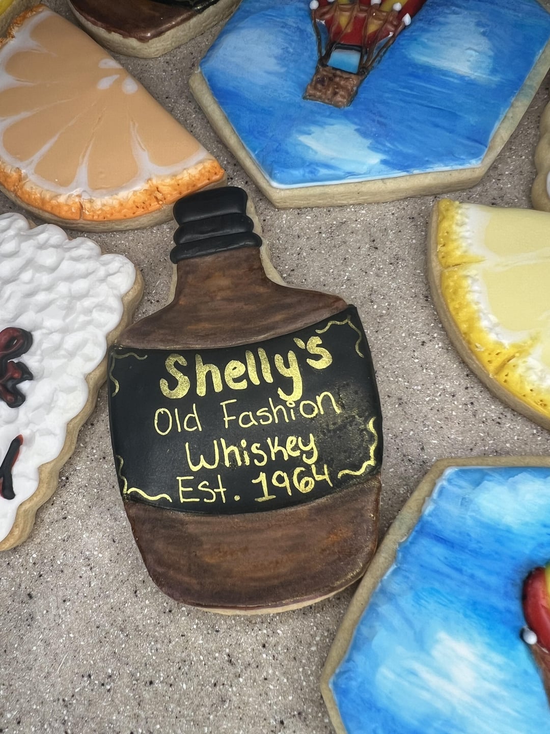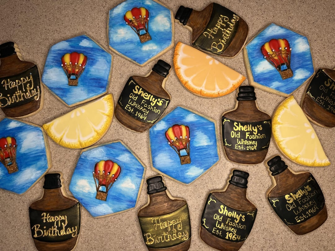 First time using ever-clear to make edible paint with my food dyes. I actually prefer the sky background before the added paint shading but it was used to cover up minor bleeding that occurred from the hot air balloons. It did the job perfect so just thought id share! I also painted the whiskey bottles(: